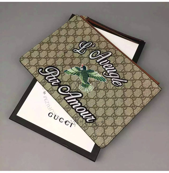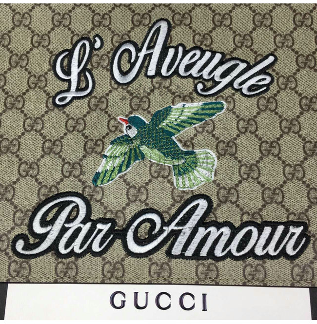 새 모양의 아플리케 자수 장식이 들어간 GG 수프림 캔버스 파우치.