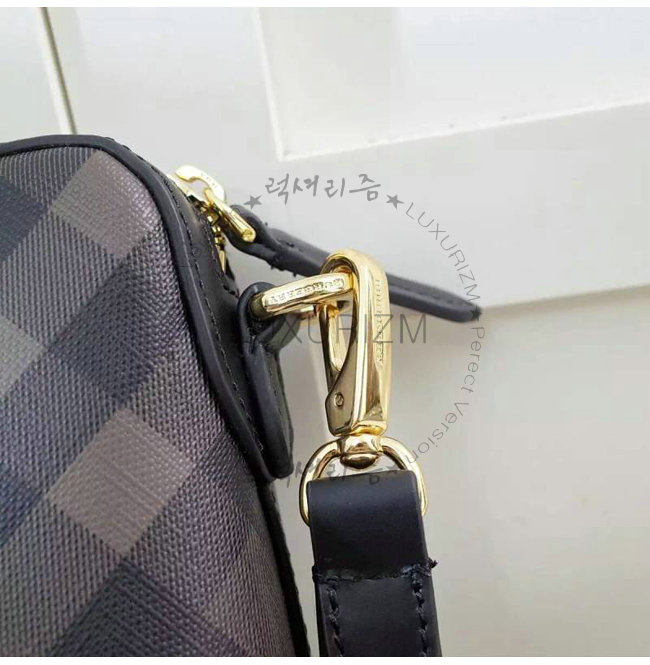런던 체크 패턴에 가죽 트리밍이 돋보이는 파우치로 여유로운 이중 수납칸과 내부의