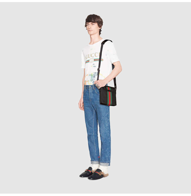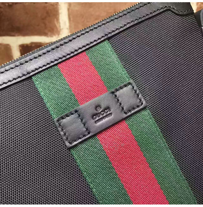 그린/레드 web 디테일의 스몰사이즈 테크노 캔버스 메신저 백.