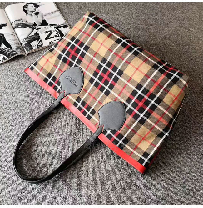 타탄 체크패턴이 돋보이는 양면디자인의 토트.접착면 소재로 제작된 여성과 남성