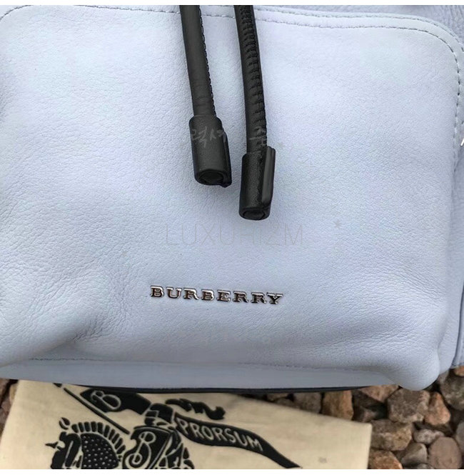 드로스트링 여밈 수작업으로 마감칠된 테두리 유광금속 하드웨어 앞면의 버버리 양각로고.