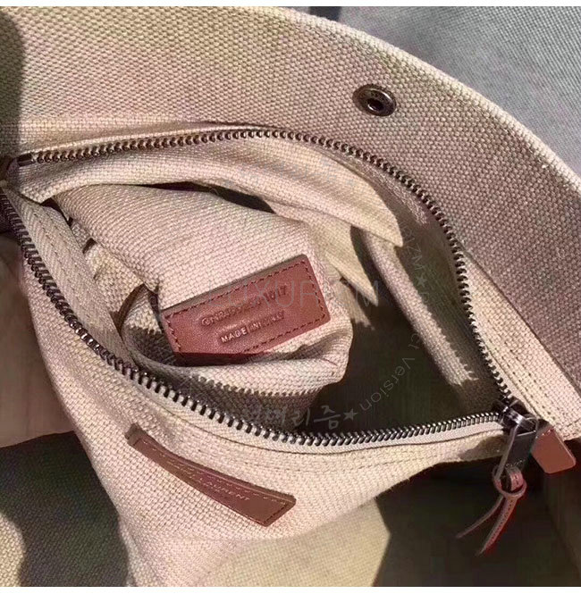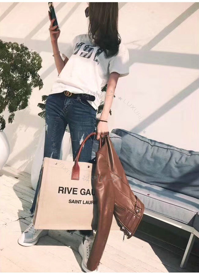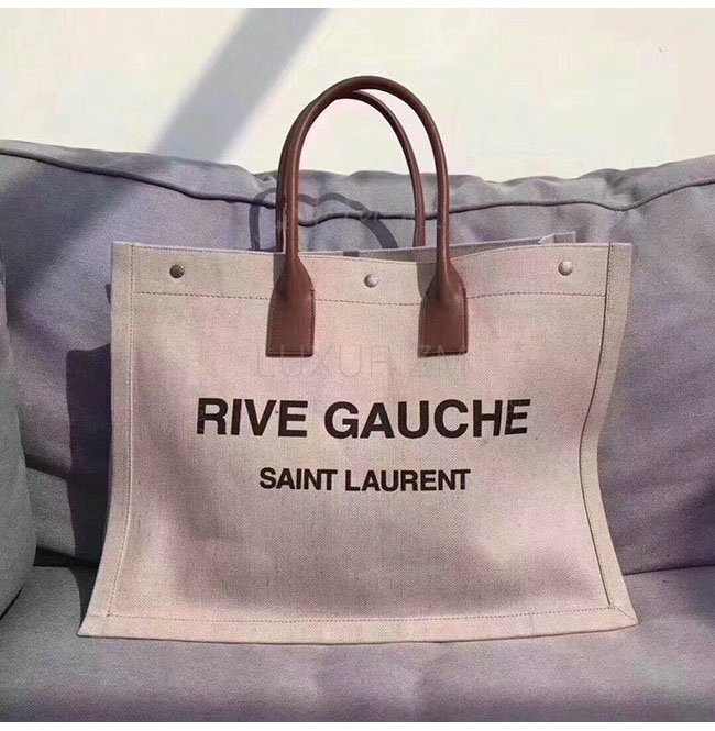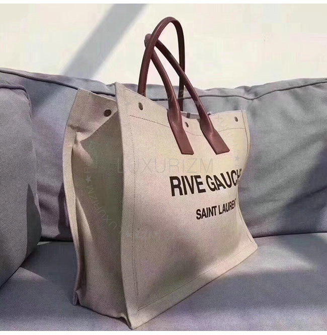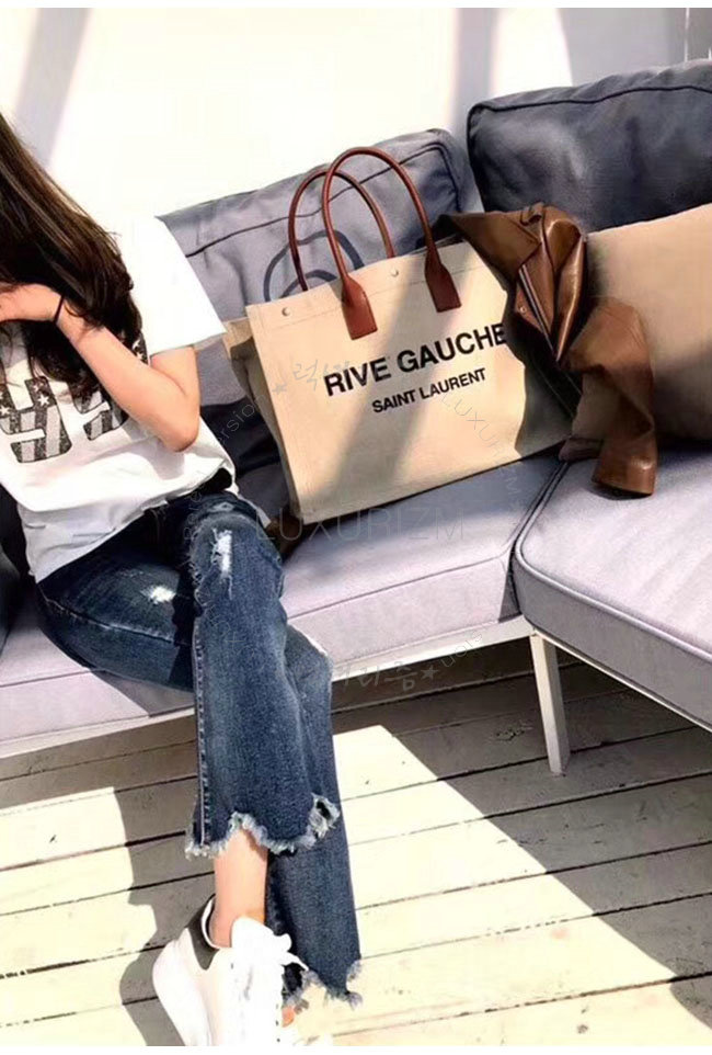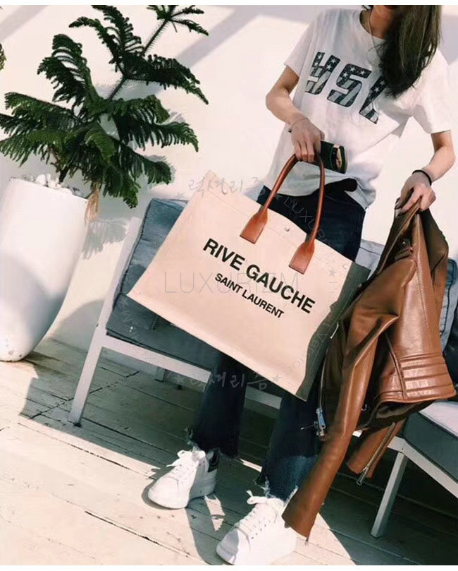 SAINT LAURENT-499290 생 로랑 베이지 린넨 코냑 가죽 블랙 손잡이 라이브 가우슈 토트백 가격 : 300,000원