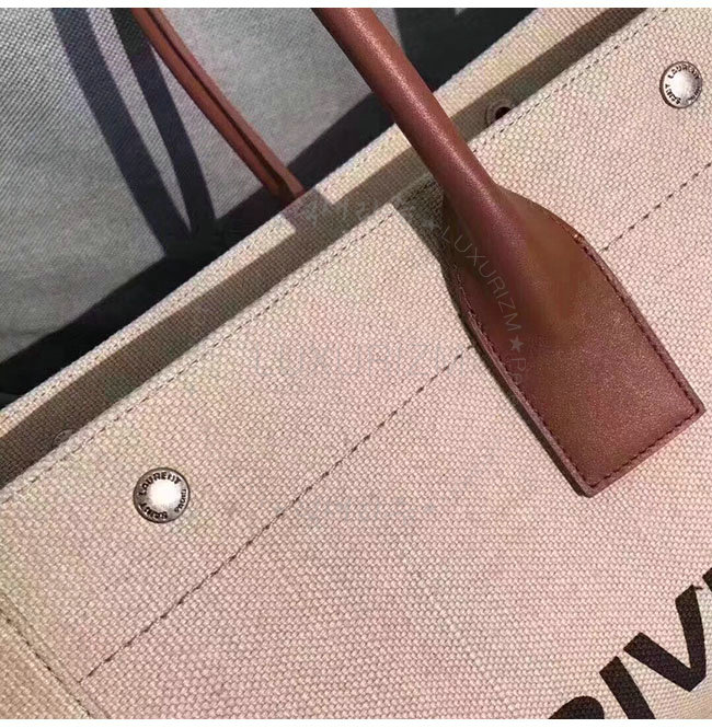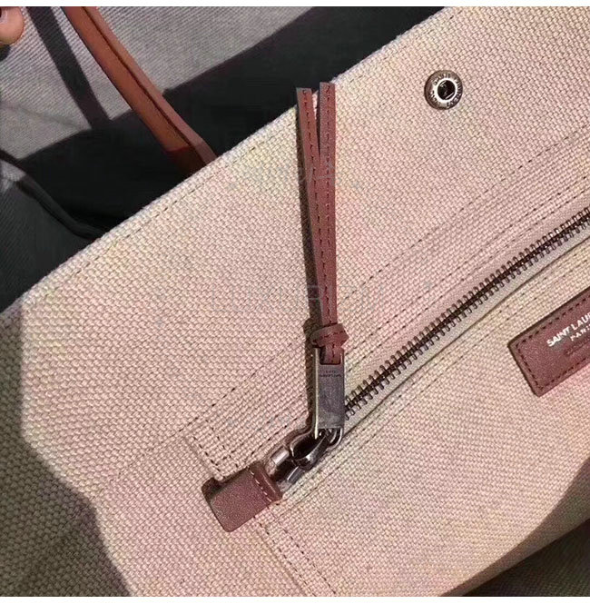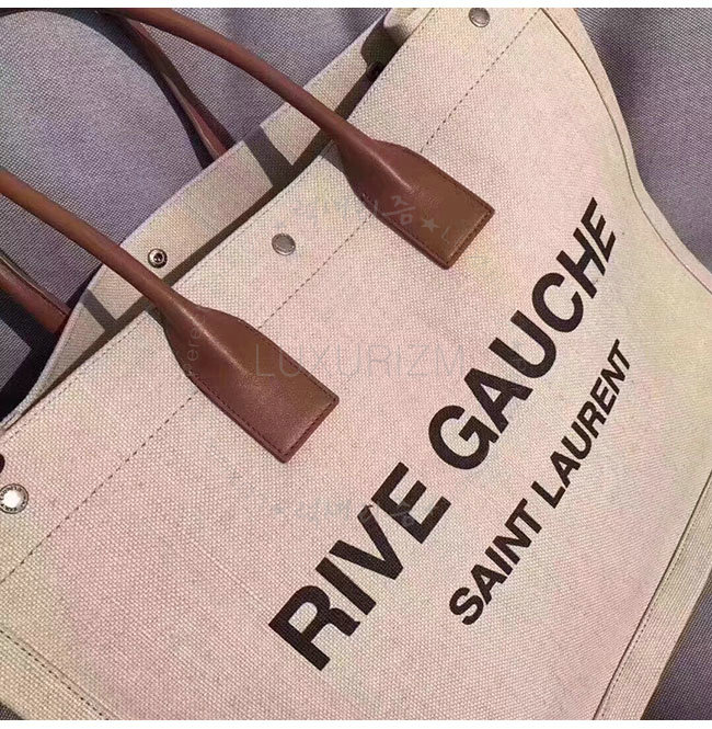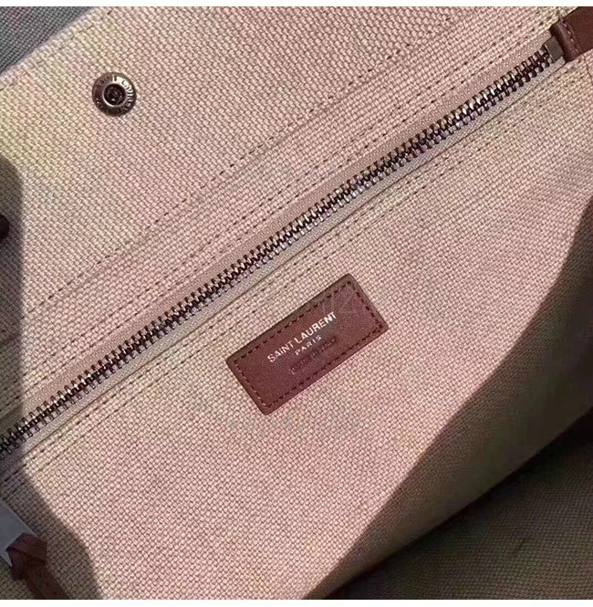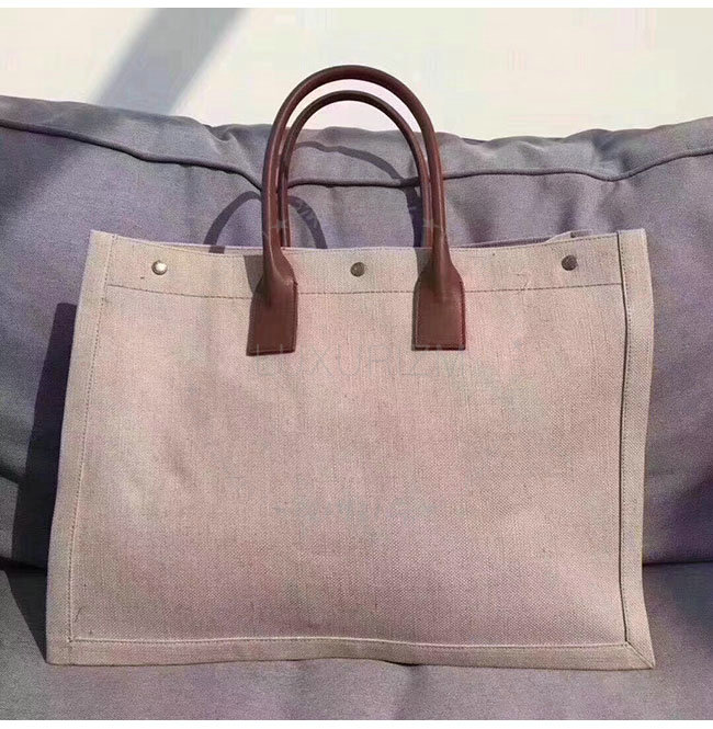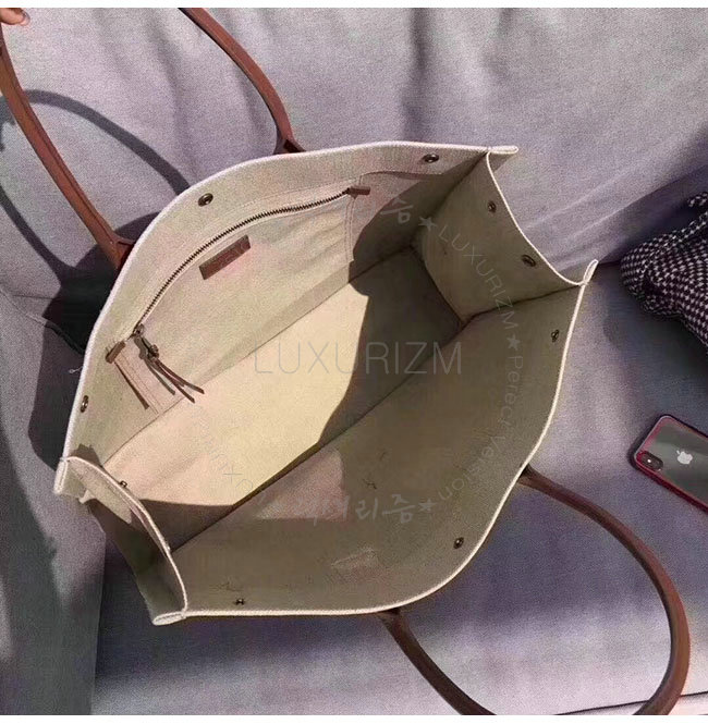 SAINT LAURENT-499290 생 로랑 베이지 린넨 코냑 가죽 브라운 손잡이 라이브 가우슈 토트백