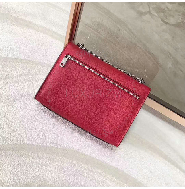 송아지 가죽 소재로 제작된 이 가방은 긴 체인 덕분에 크로스-바디 스타일로 착용할 수도 있고