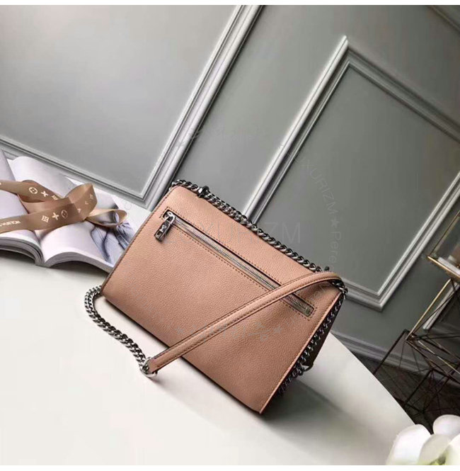 송아지 가죽 소재로 제작된 이 가방은 긴 체인 덕분에 크로스-바디 스타일로 착용할 수도 있고