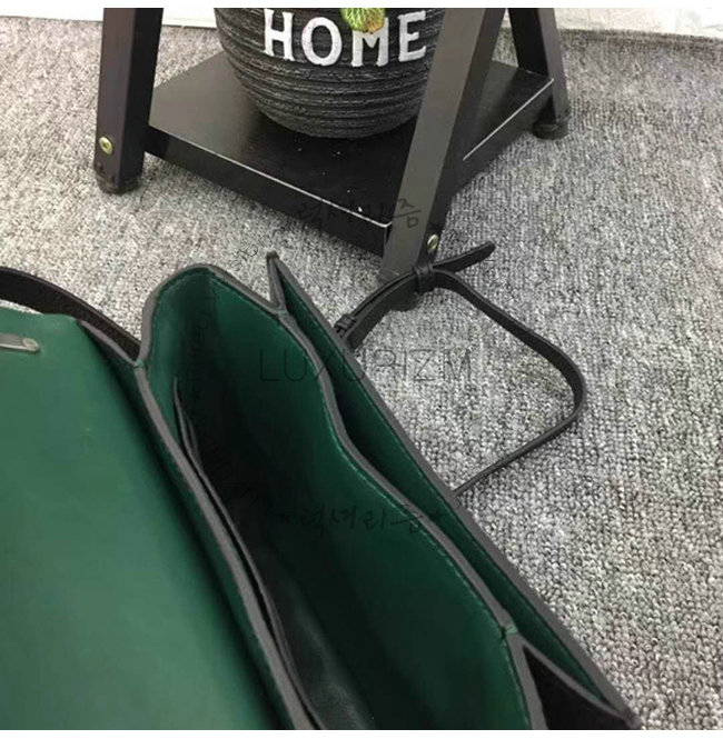 D링 여밈의 접이식 플랩 수작업으로 마감칠된 테두리 유광 금속 하드웨어.