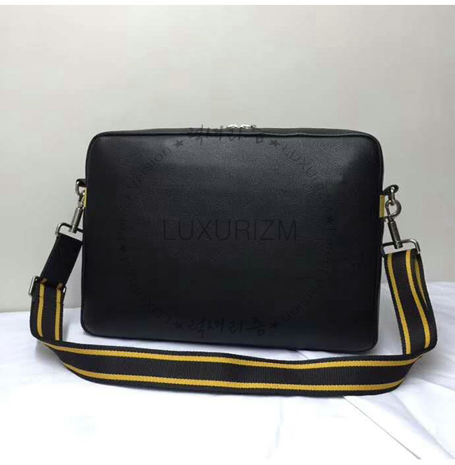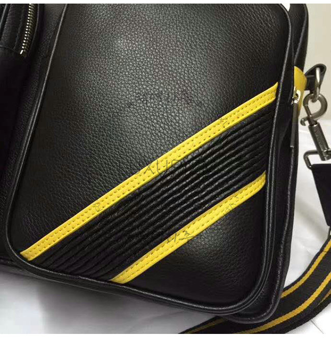 포켓. 검은 색과 노란색 스트라이프 캔버스의 탈착식 어깨 끈. 금속 지퍼 및 세부 사항.