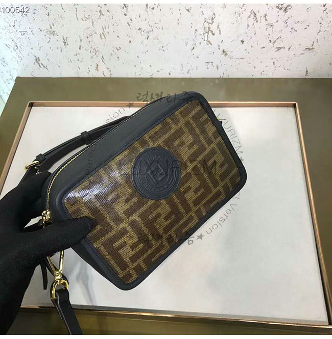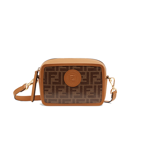 지퍼 잠금장치와 내부의 플랫 포켓. 글레이즈드 패브릭 소재. 브라운 컬러의 FF