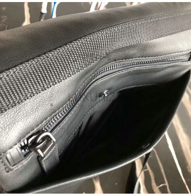 송아지 가죽 외부에 트라이앵글 로고, 내부에 태그 로고 숄더 패드가 있는 조절형 우븐