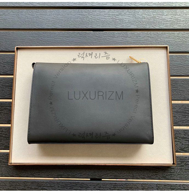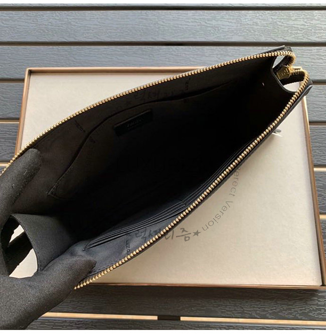 지퍼 잠금장치의 포셰트. 내부 플랫 포켓. 블랙 컬러의 송아지 가죽 소재.