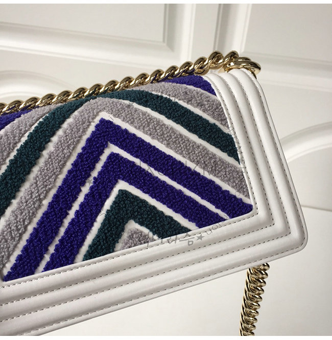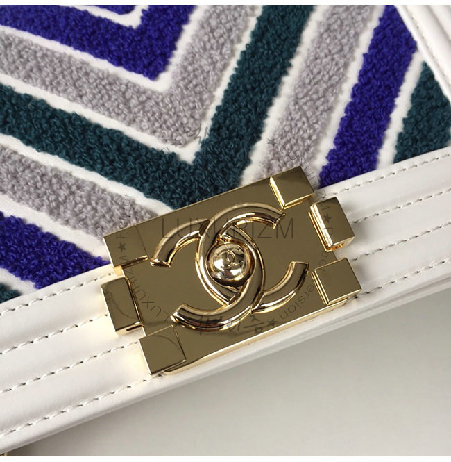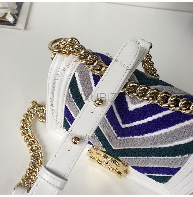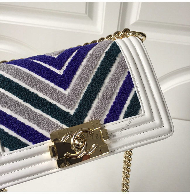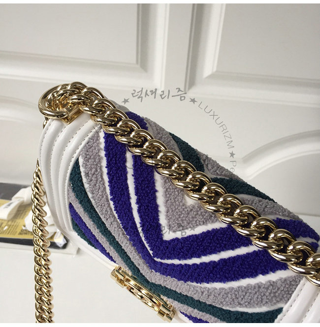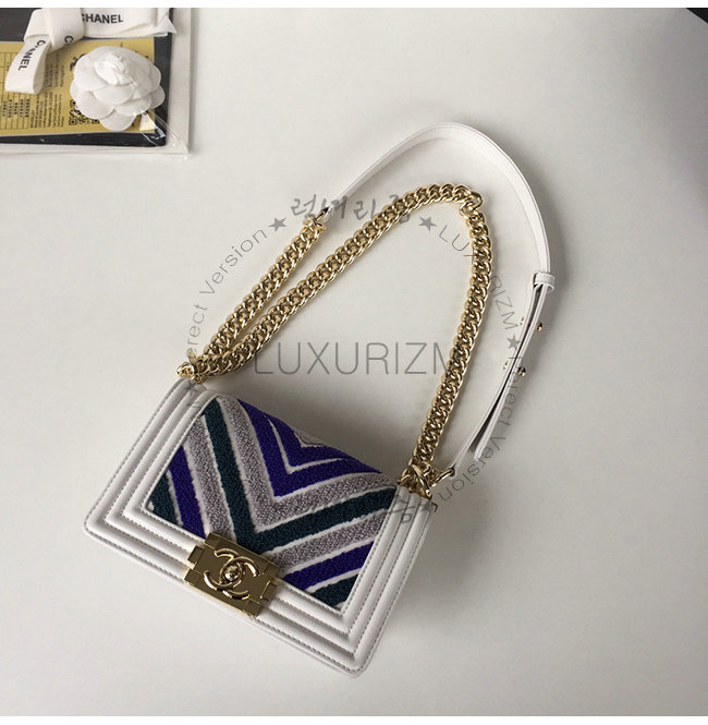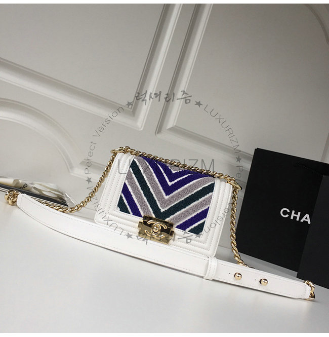 [스페셜오더]CHANEL-A67085 샤넬 블루 화이트 자수 장식 카프스킨 루렉스 골드메탈 보이 샤넬 스몰 플랩백