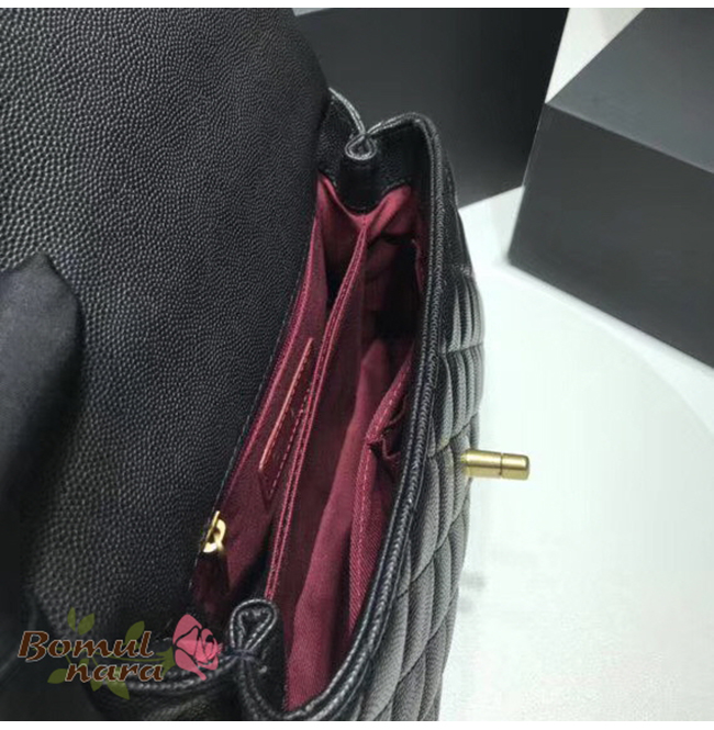 다이아몬드 퀄팅 마감과 정면 엔틱금장 CC로고 잠금쇠.