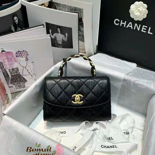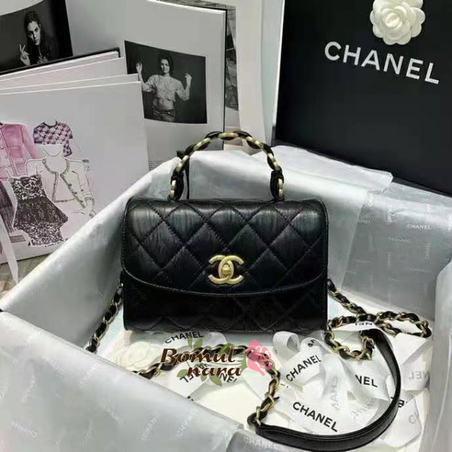 램스킨 특유의 질감과 샤넬 로고 핸들 특징인 탑 핸들백.