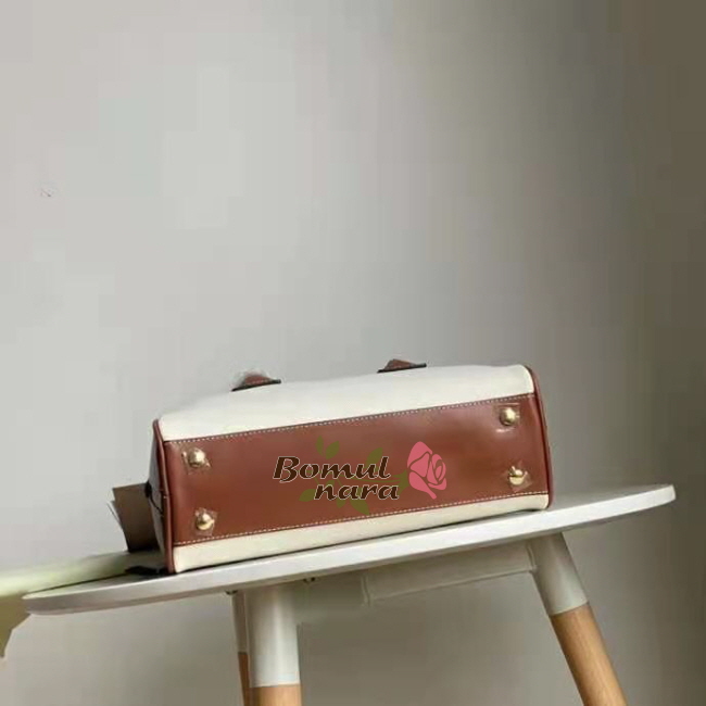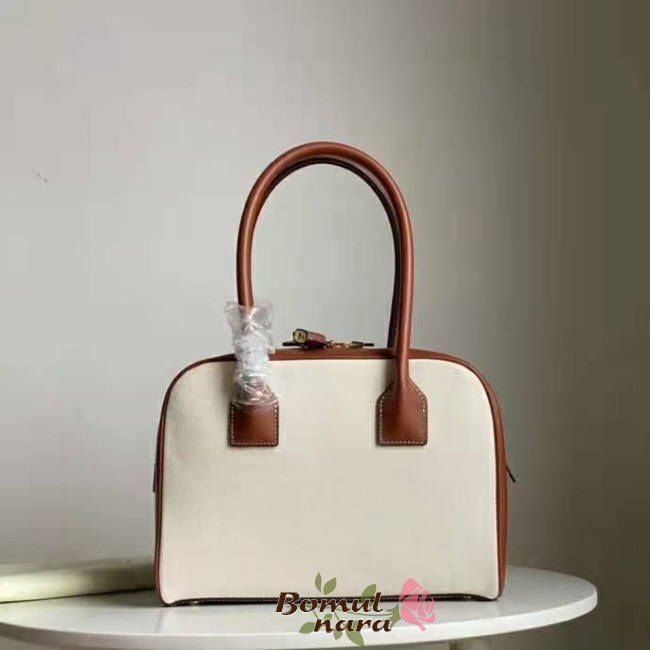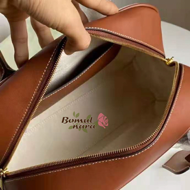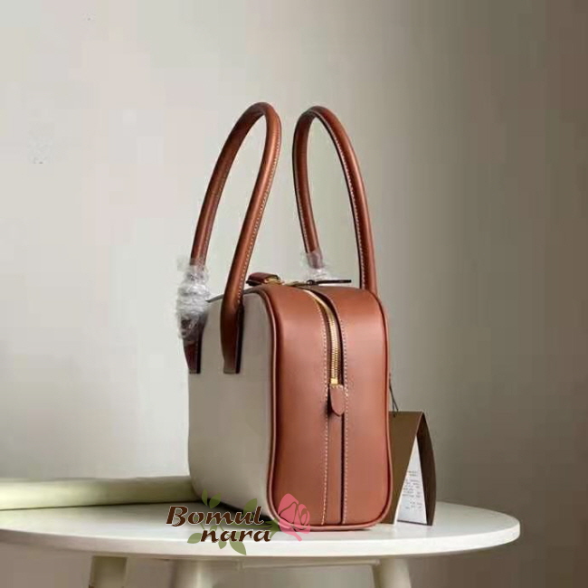 디자인으로, 둥글게 말린 상단 가죽 손잡이가 특징입니다.