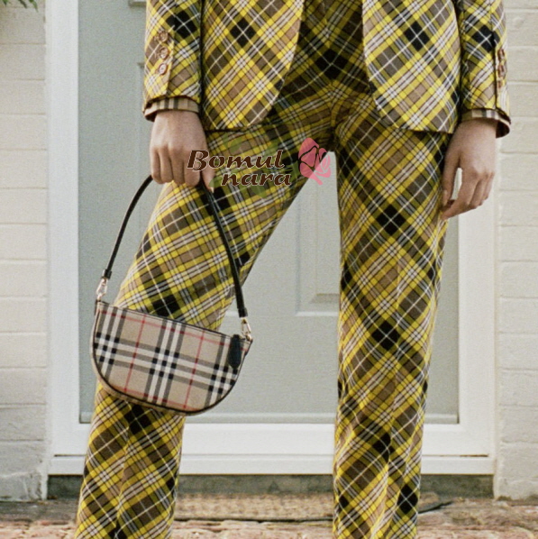 곡선 실루엣의 슬림한 파우치는 빈티지 체크 면과 가죽 소재