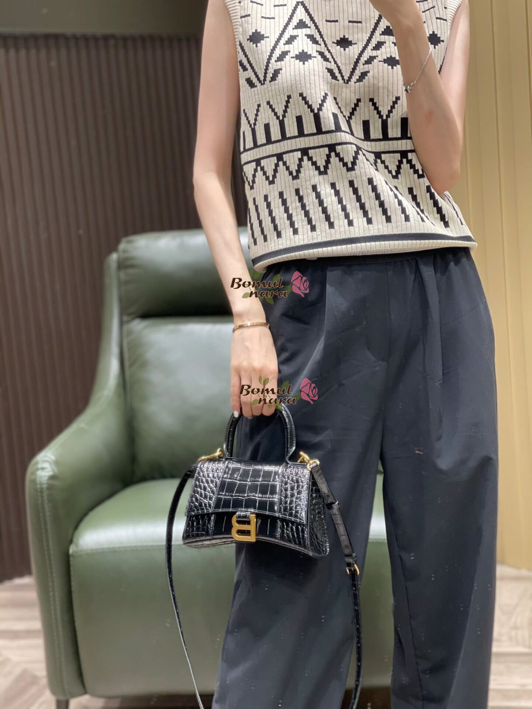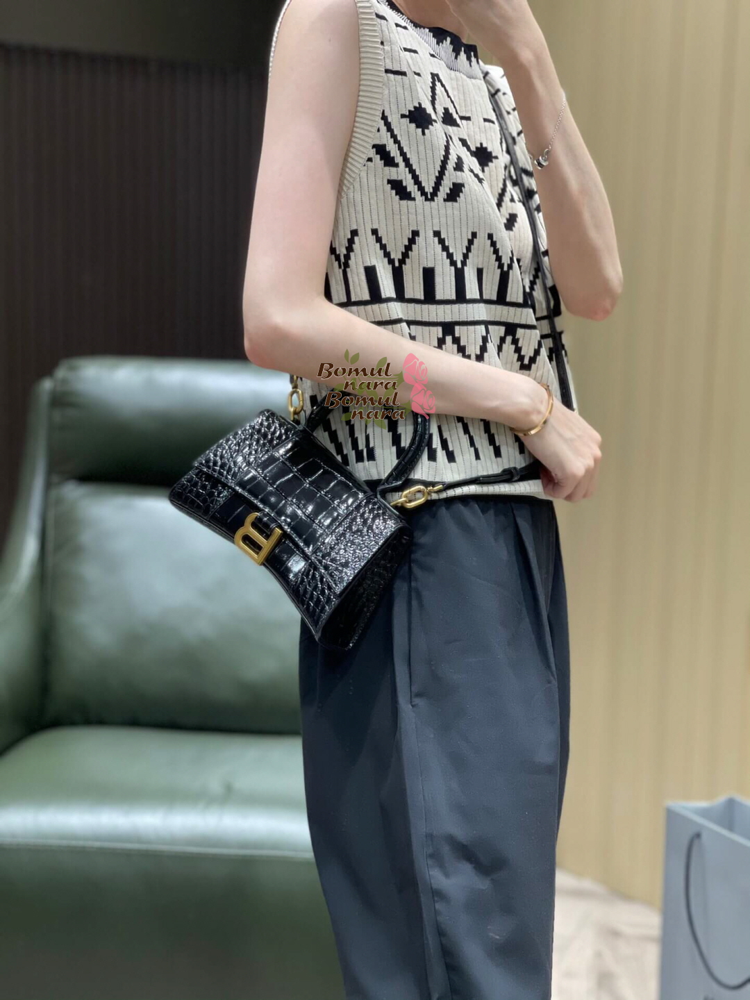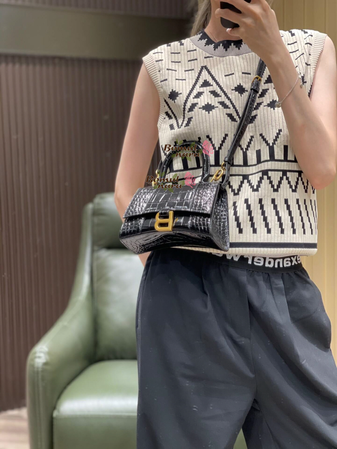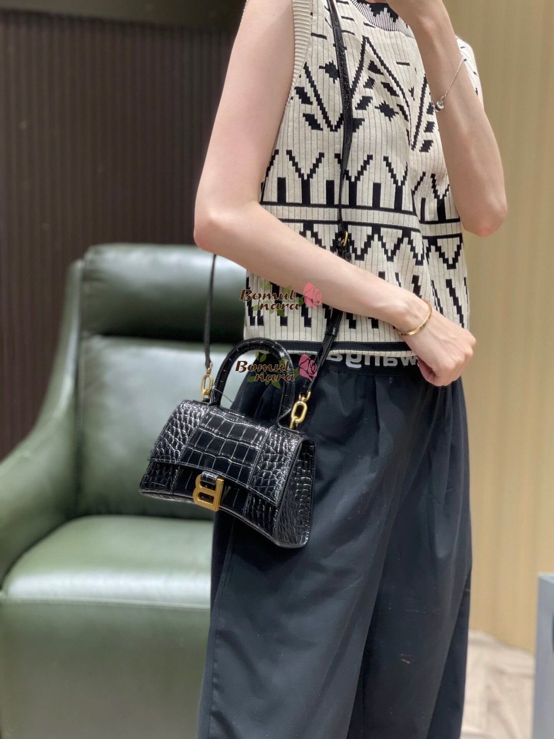 [스페셜오더]BALENCIAGA-592833 발렌시아가 블랙 크로커다일 엠보싱 송아지 가죽 아워글래스 탑 핸들 백 XS 가격 : 380,000원