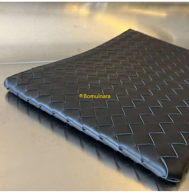 가죽 소재를 인트레치아토 위빙으로 완성한 파우치.