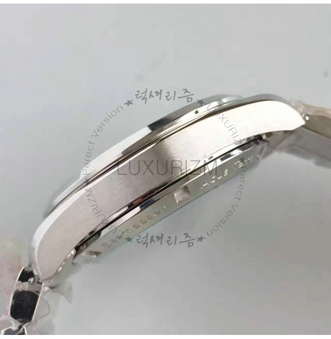 베젤은 41.5mm 스테인리스 스틸 케이스에 고정되어 스테인리스 스틸 브레이슬릿 위에 놓여집니다.