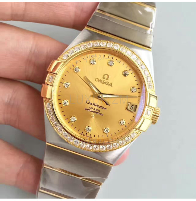 [스페셜오더]OMEGA-오메가 컨스텔레이션 옐로우 골드 다이아 인덱스 베젤 스틸 샴페인 워치 38mm