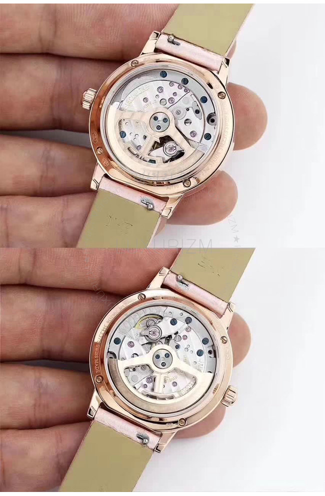 -핑크 골드 IPG 특수이온 도금 케이스/사파이어 투명 케이스 백/가죽 스트랩.
