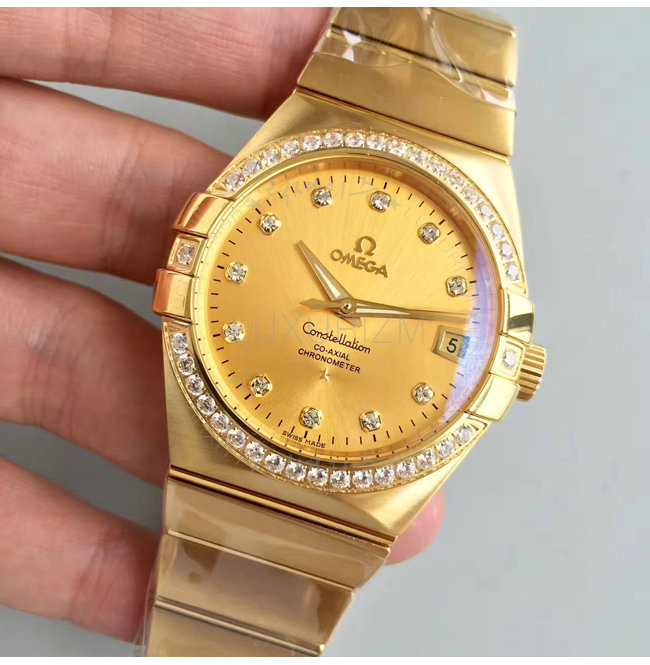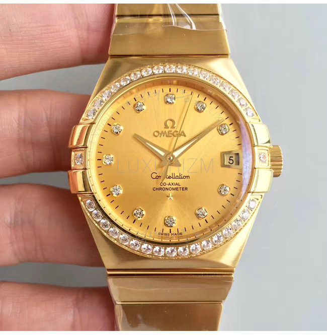 [스페셜오더]OMEGA-오메가 컨스텔레이션 옐로우 골드 다이아 인덱스 베젤 옐로우 드레스워치 38mm