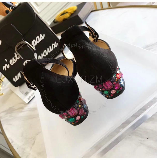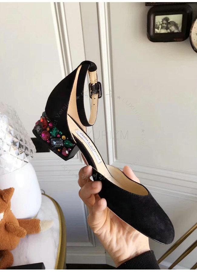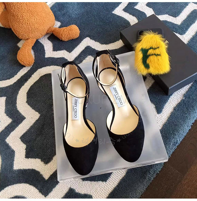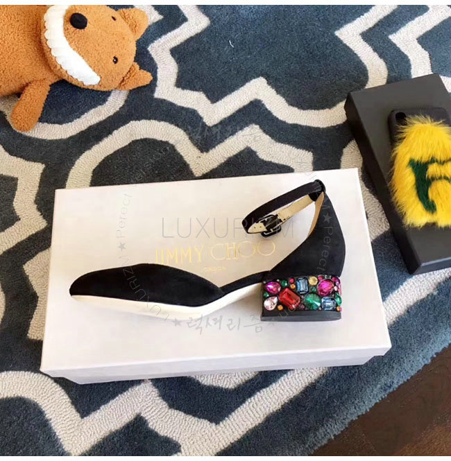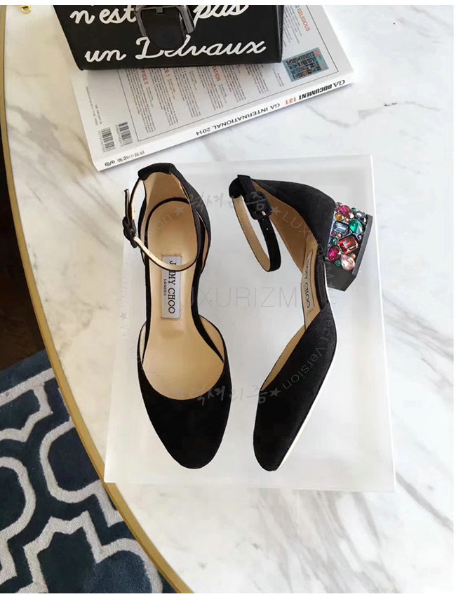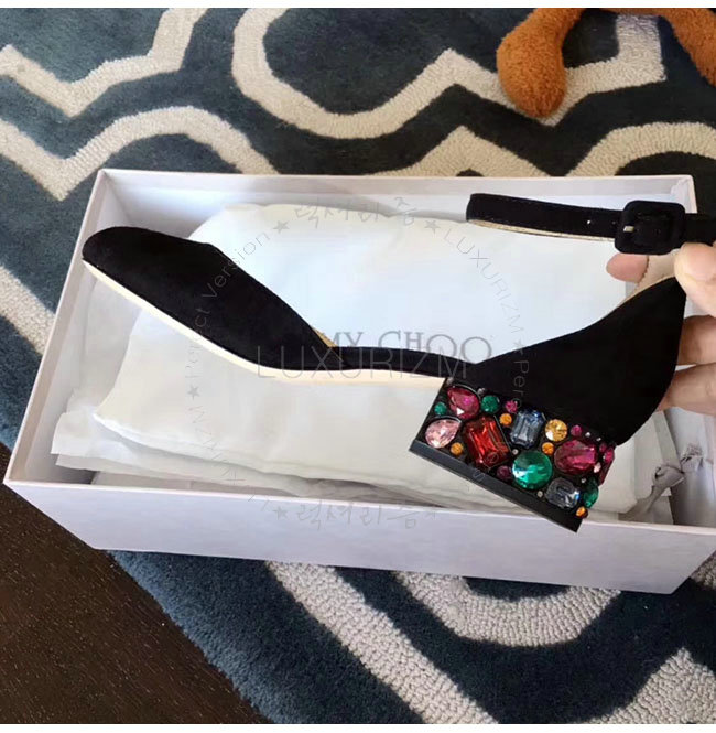 JIMMY CHOO-MARNIE 지미추 블랙 스웨이드 가죽 라운드 투 마니 장식 힐 펌프스 여성용