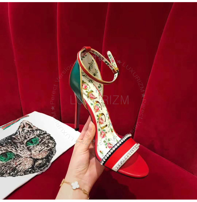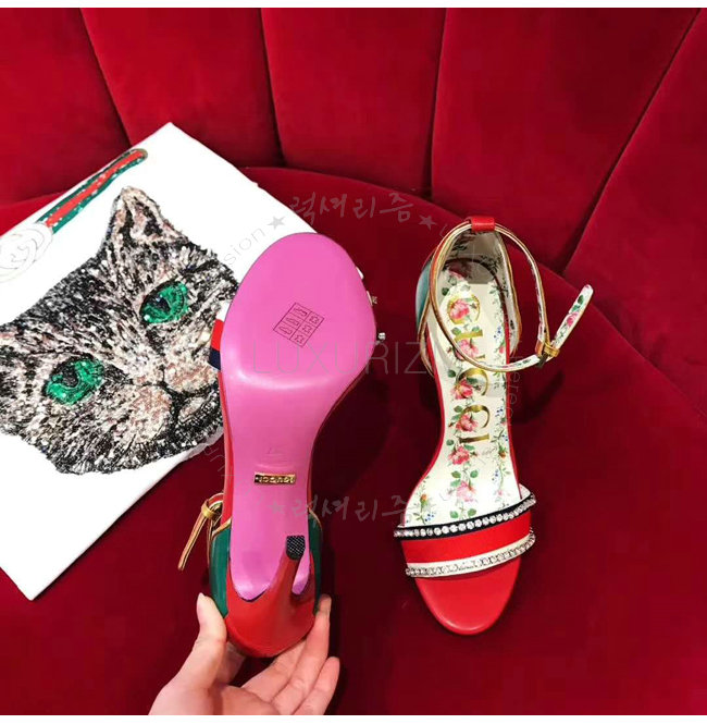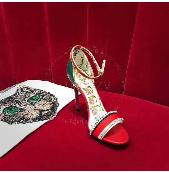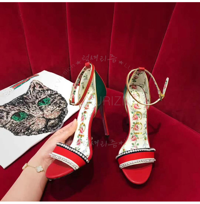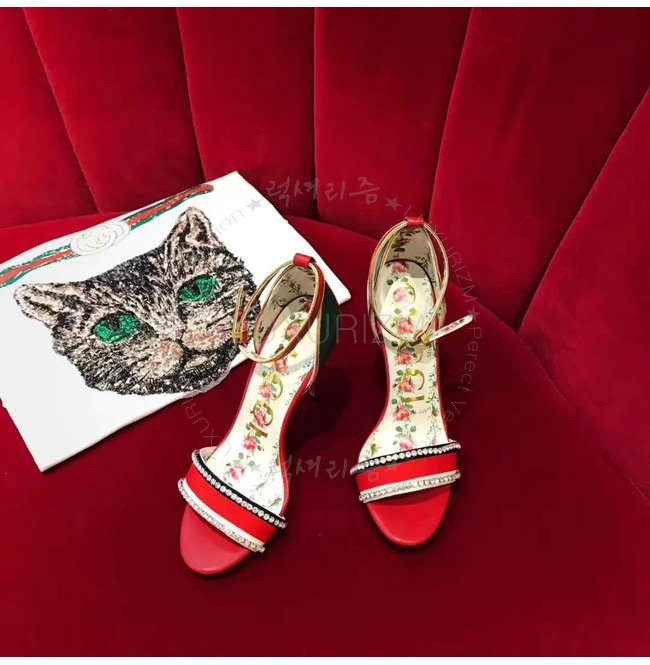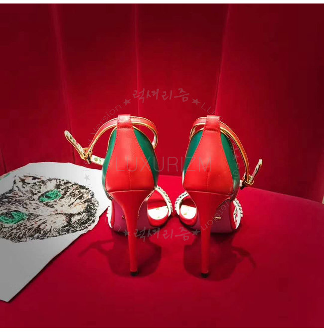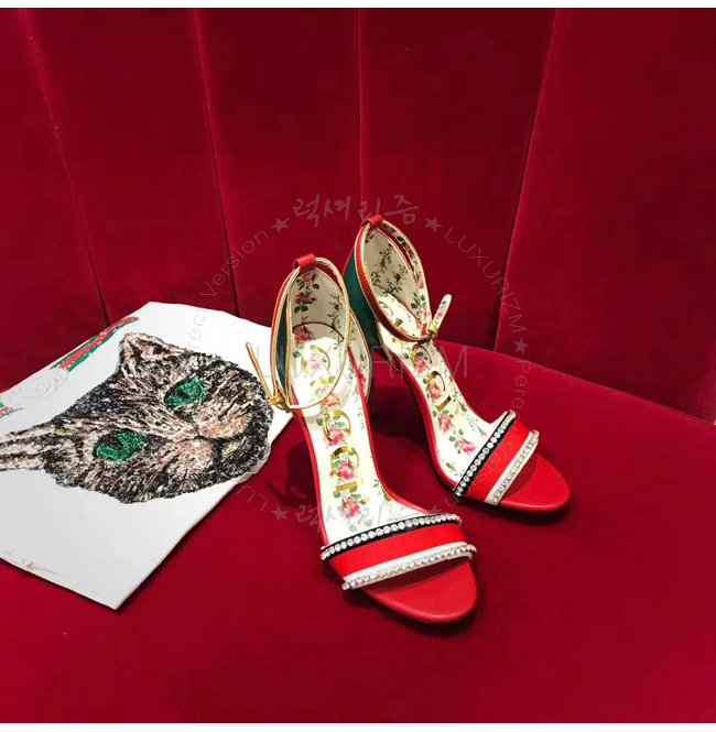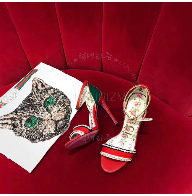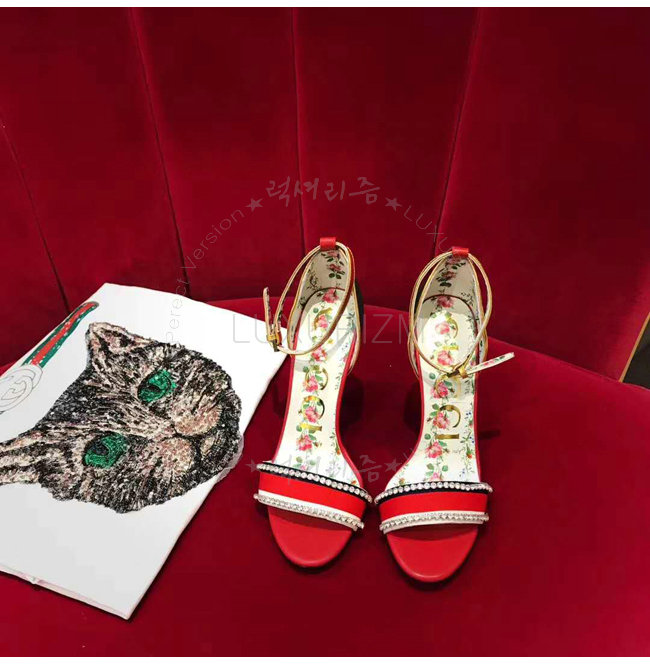 GUCCI-493937 8073 구찌 레드 가죽 크리스탈 장식 하이힐 샌들