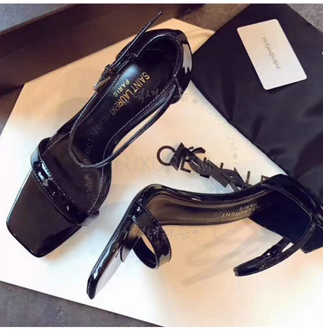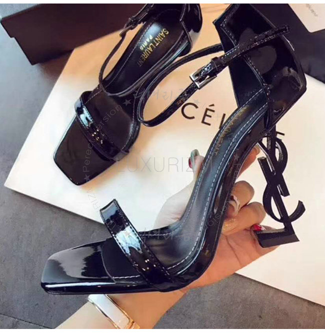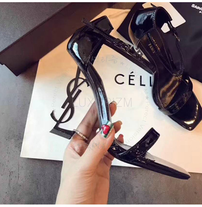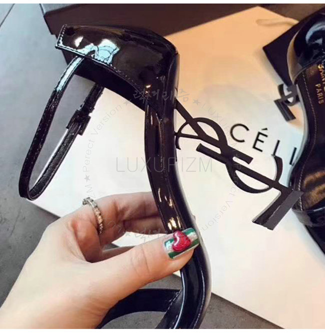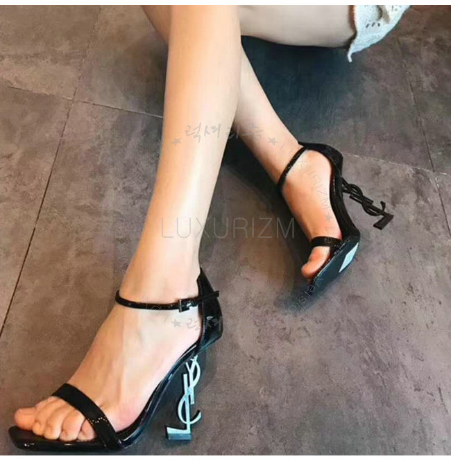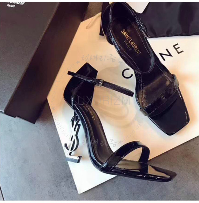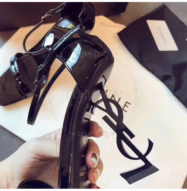 SAINT LAURENT-500250 생 로랑 송아지 가죽 메탈 YSL 모노그램 힐 블랙 샌들