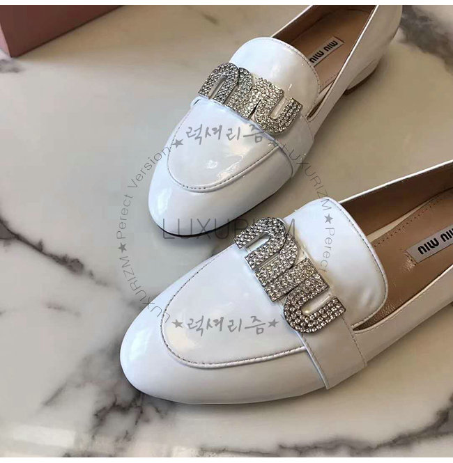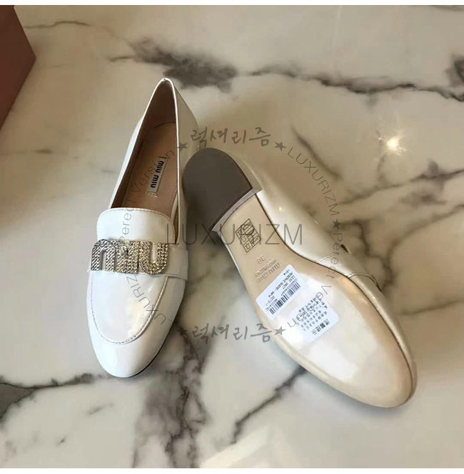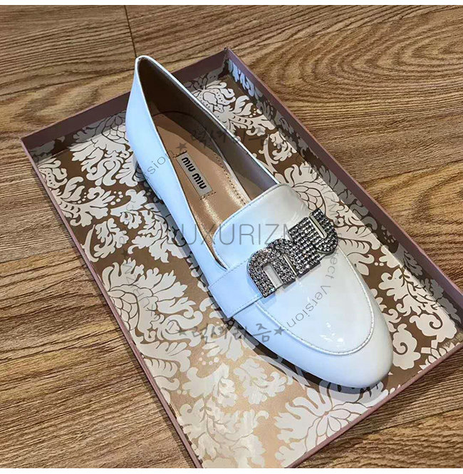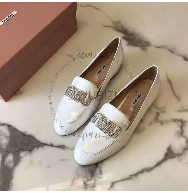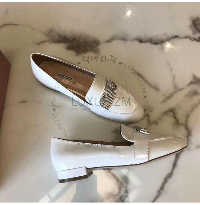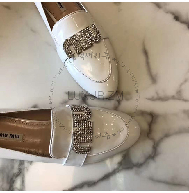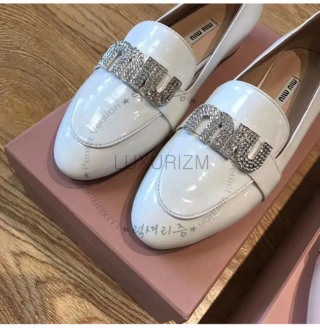 MIUMIU-5D085C 미우미우 페이턴트 카프스킨 크리스탈 장식 화이트 모카신