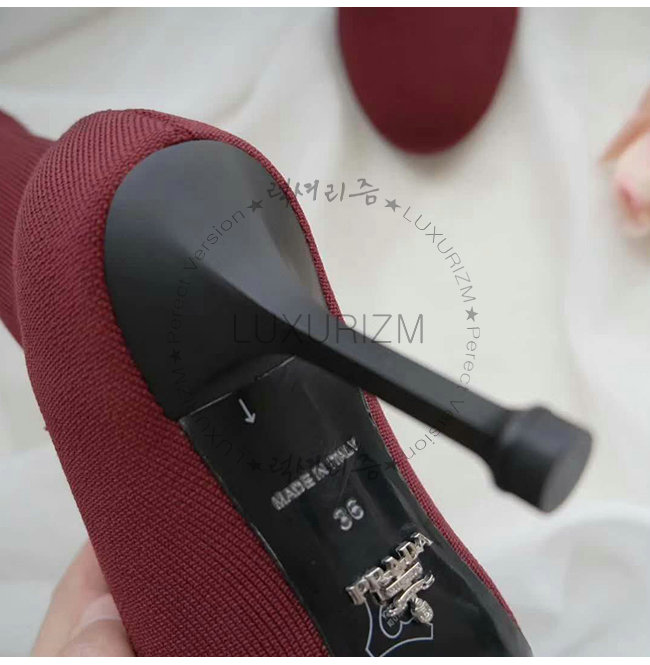 갑피: 스트레치 패브릭 라운드토 고무 트라이앵글 로고 90mm 스틸레토힐.