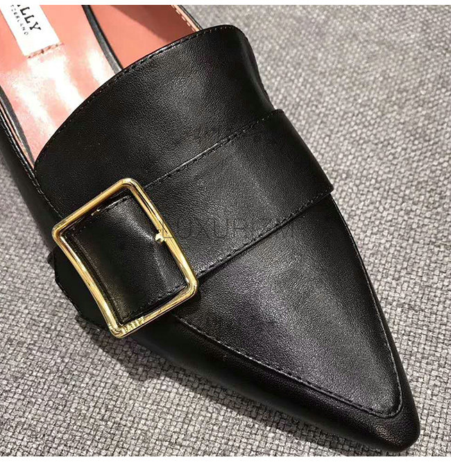 하루미 펌프는 송아지 가죽으로 만들어졌으며 얇고 직사각형의 버클 디테일이 특징입니다.