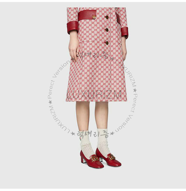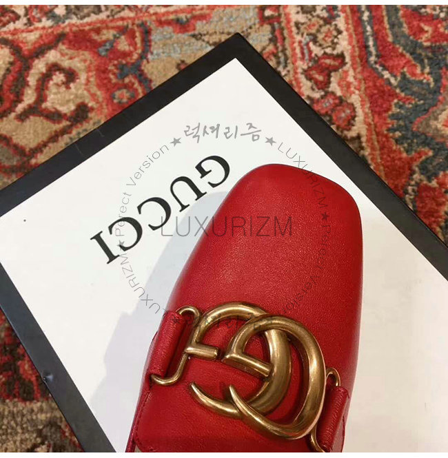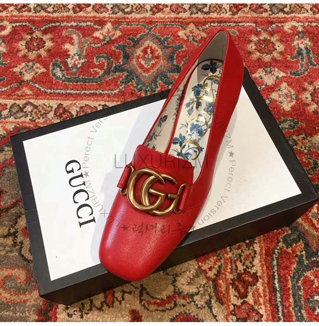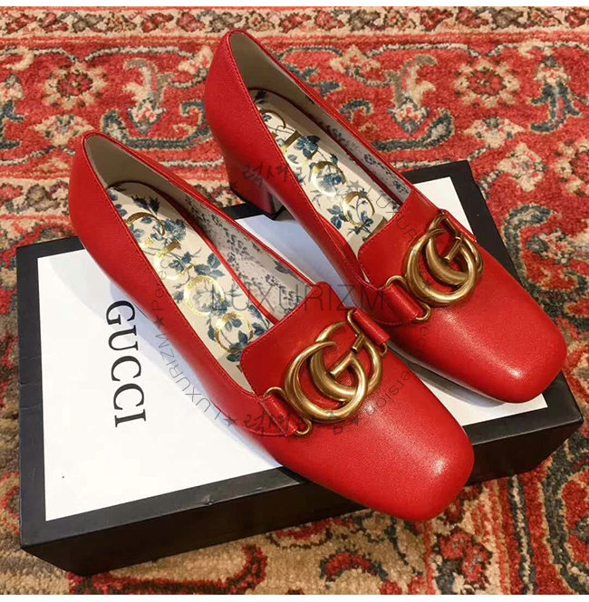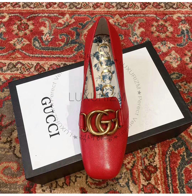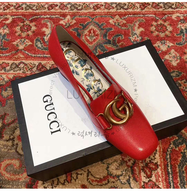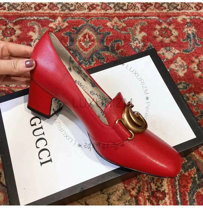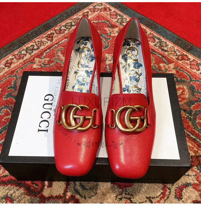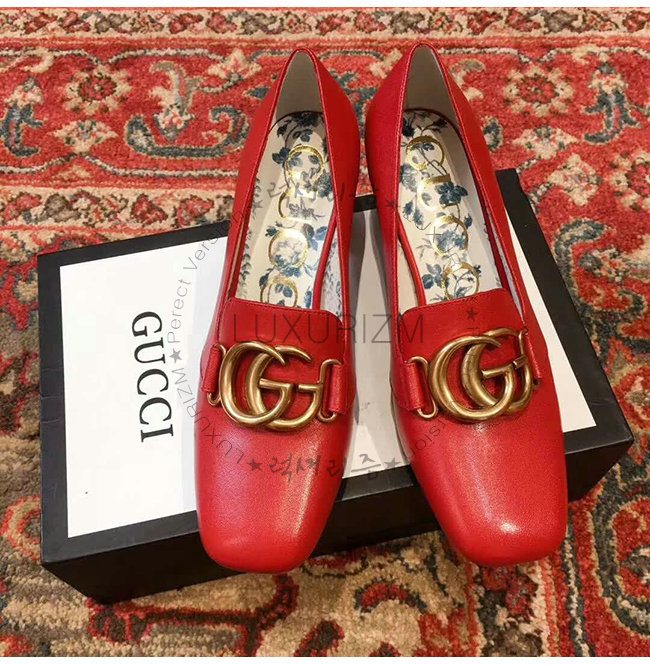 GUCCI-525333 6433 구찌 빅토아르 레드 가죽 더블 G 장식 미드힐 펌프스