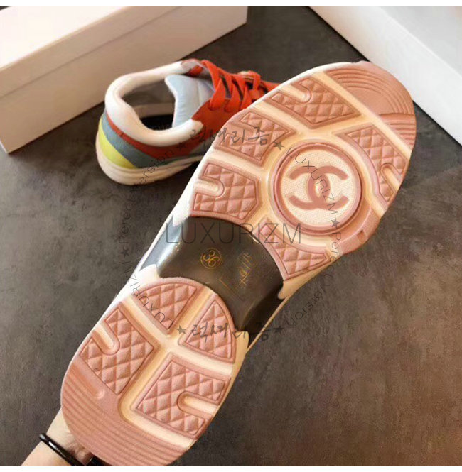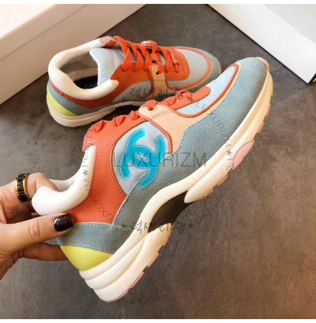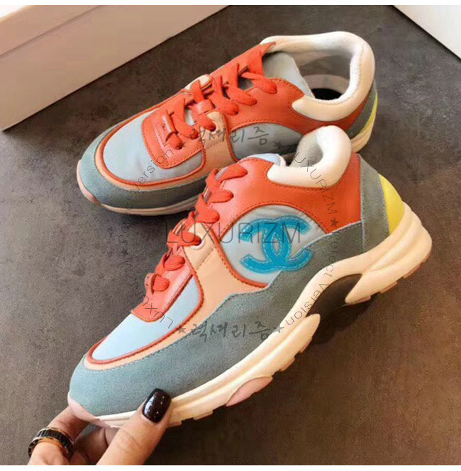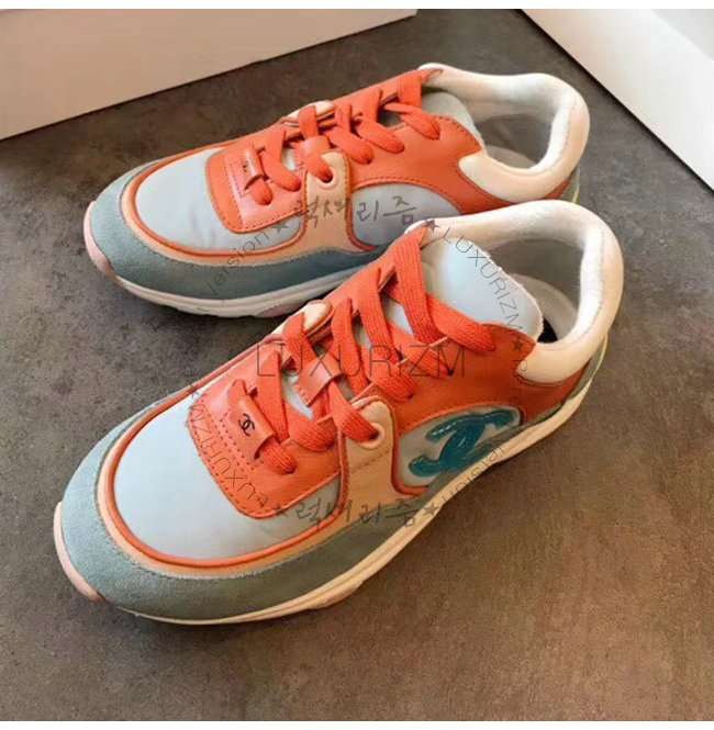 CHANEL-G34360 샤넬 코랄 라이트 블루 스웨이드 카프스킨 스니커즈