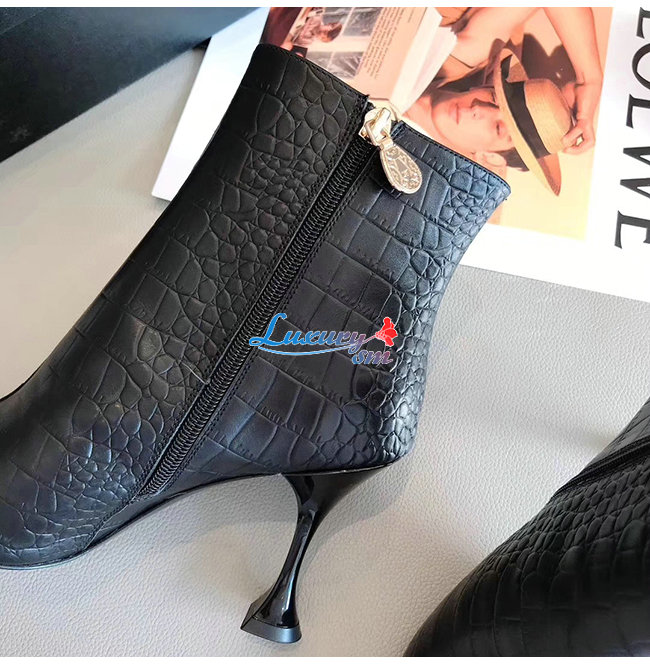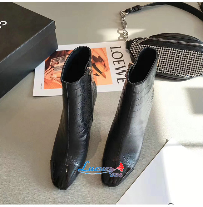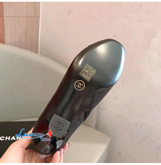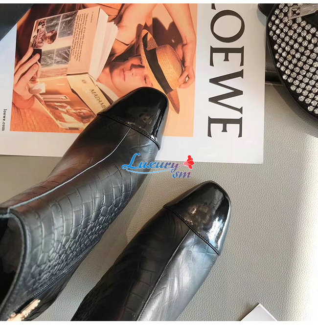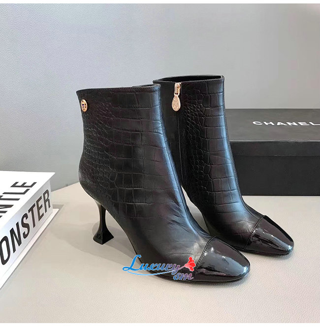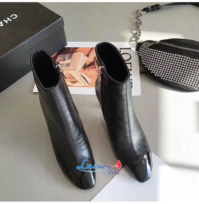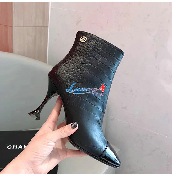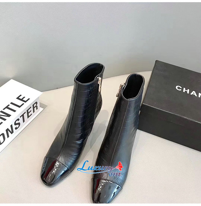 CHANEL-G34903 샤넬 블랙 매트 카프스킨 페이턴트 크럼플드 램스킨 쇼트 부츠