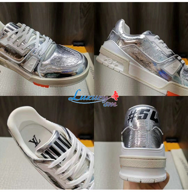 메탈릭 실버 색상의 가죽 으로 제작된 LV 트레이너