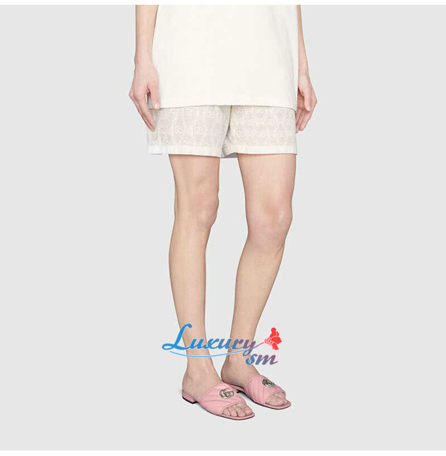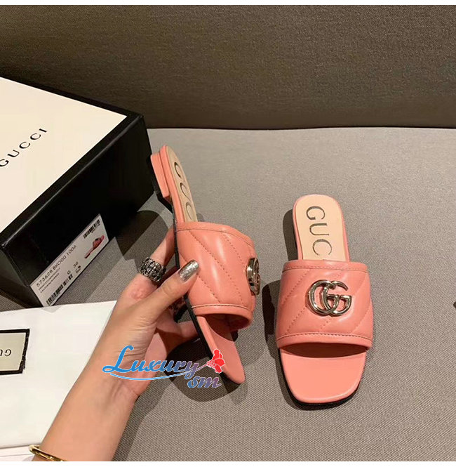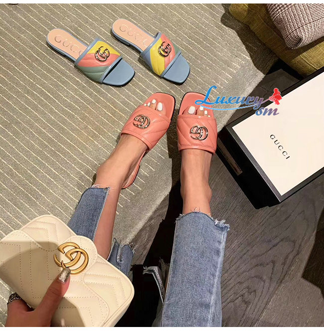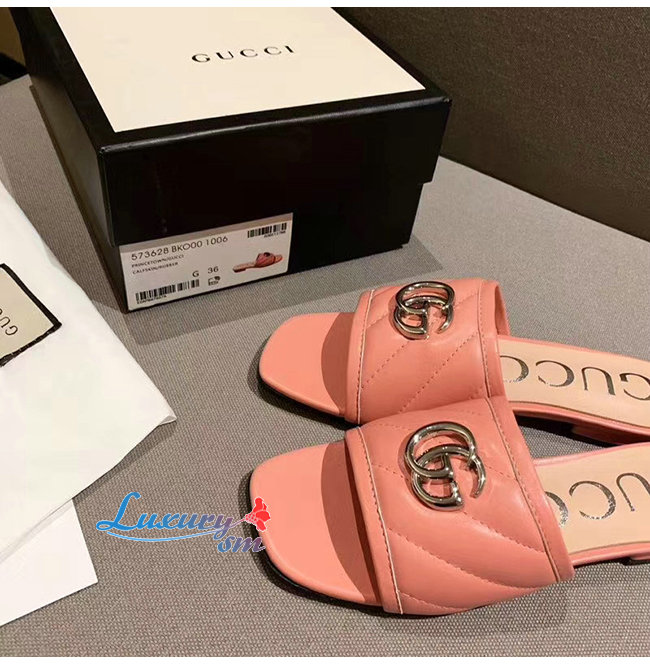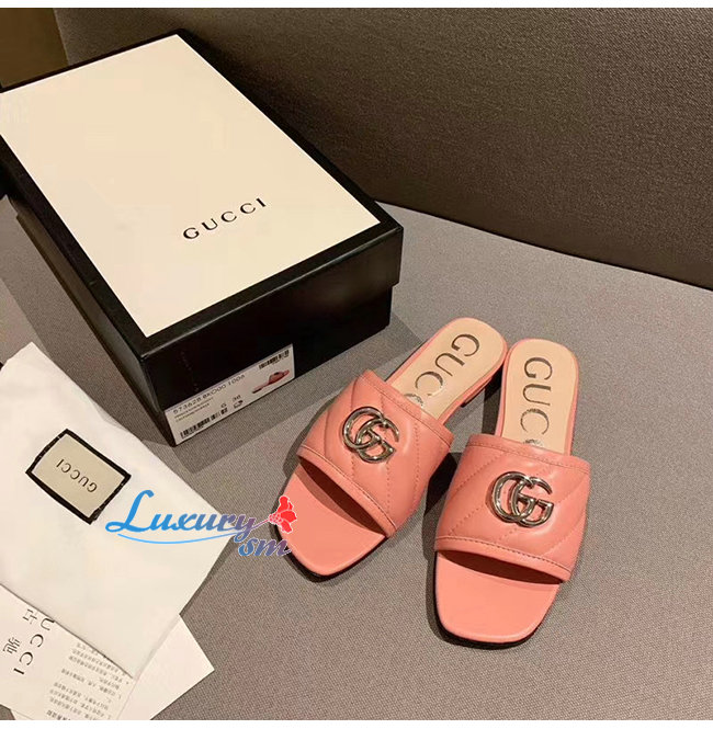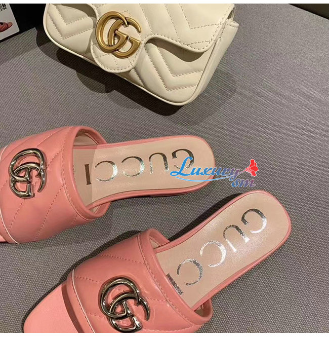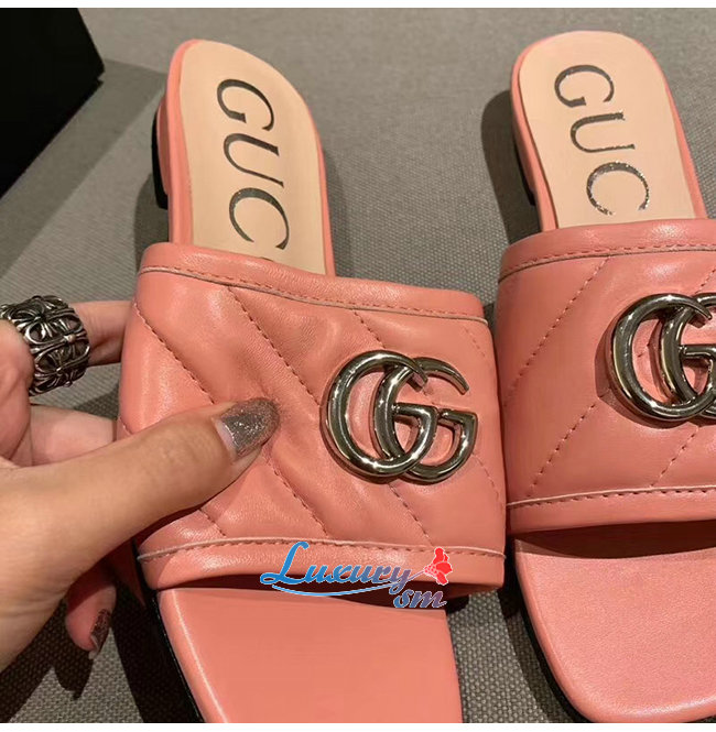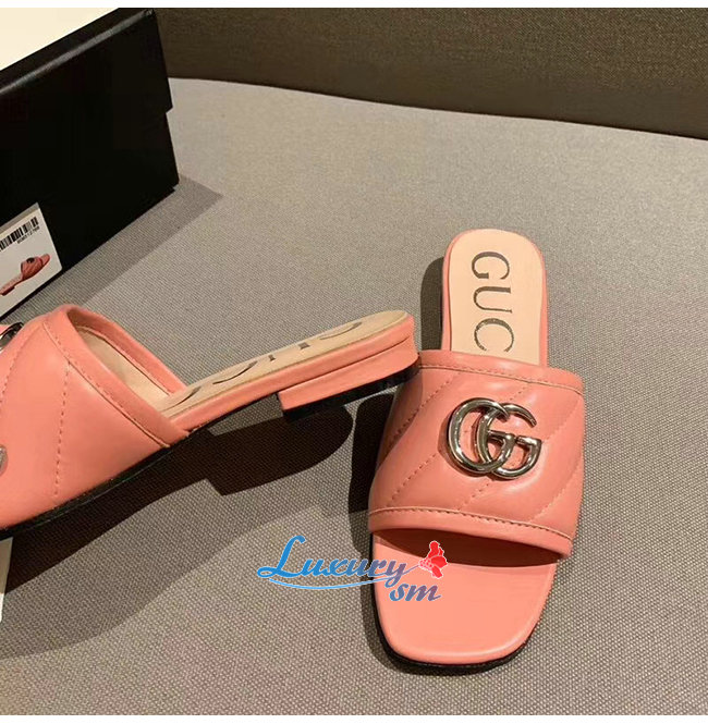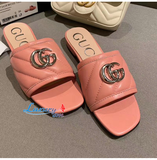GUCCI-627827 5815 구찌 핑크 마틀라세 쉐브론 가죽 더블 G 장식 슬라이드 샌들
