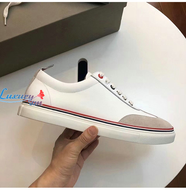 THOM BROWNE-067B001 톰 브라운 화이트 카프스킨 스트레이트 토 캡 트레이너 슈즈 남여공용