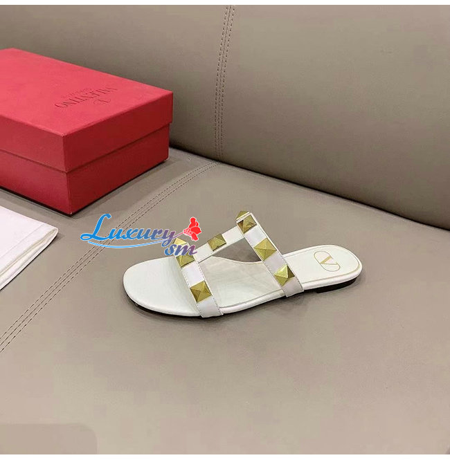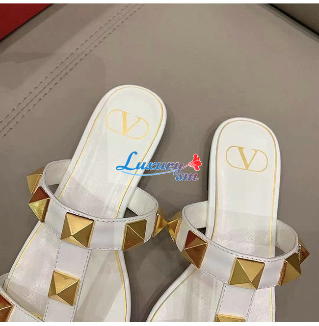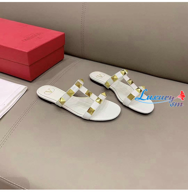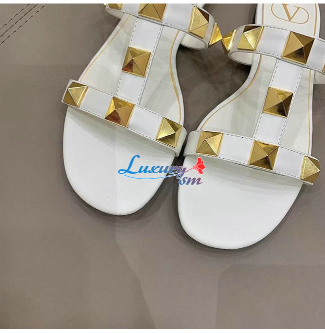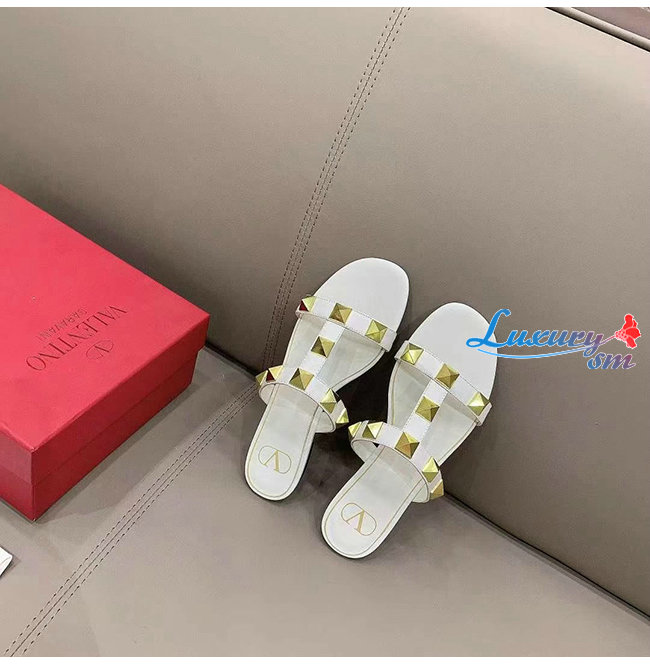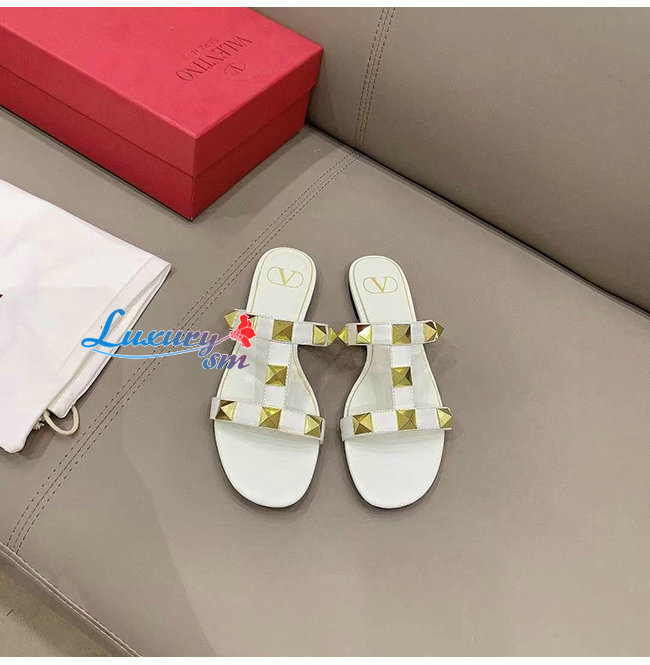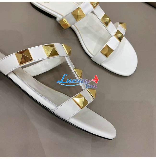 VALENTINO-WW2S0BU 발렌티노 화이트 송아지 가죽 ROMAN STUD 플랫 슬라이드 샌들 여성용