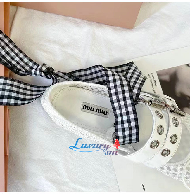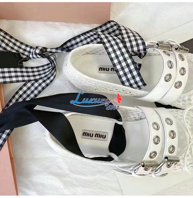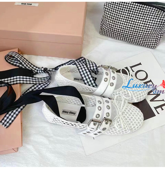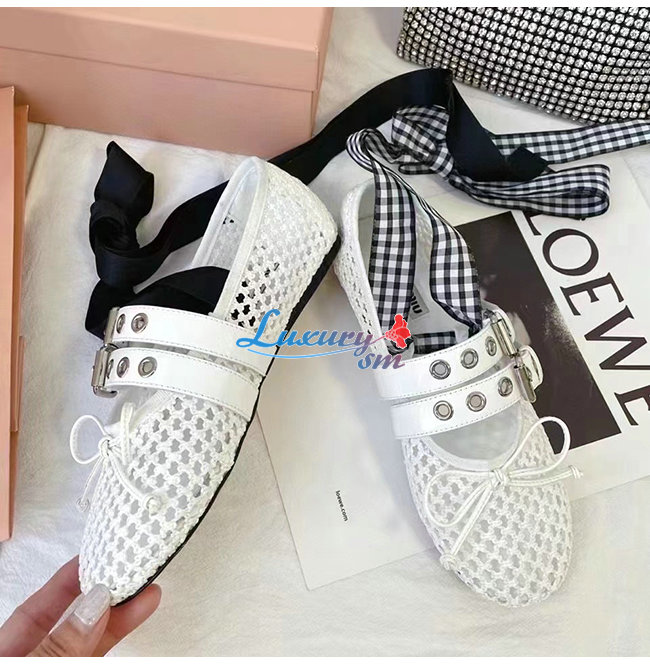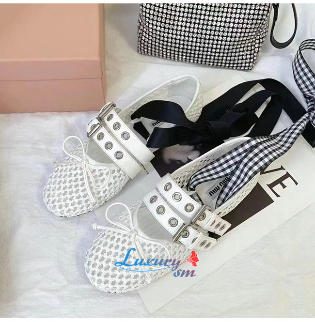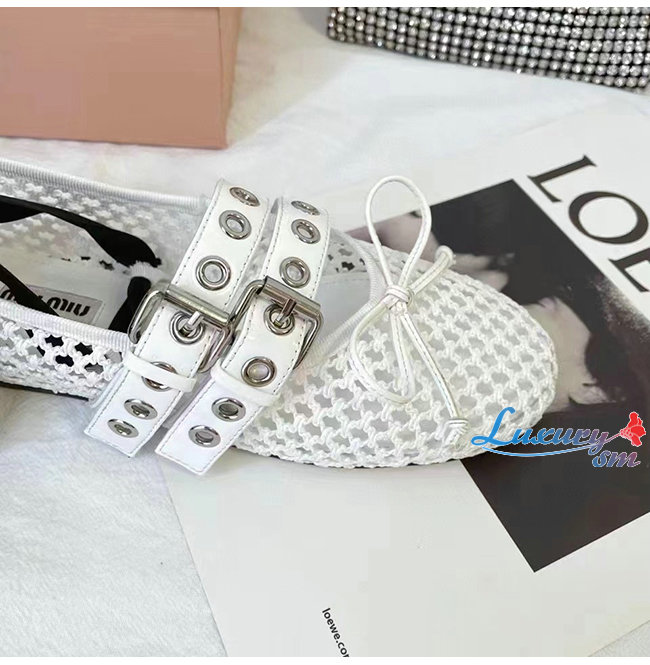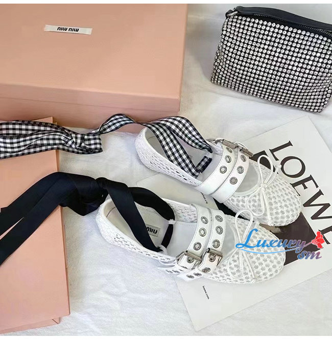 MIUMI*-5F737D 미우미우 화이트 마크라메 패브릭 발레리나