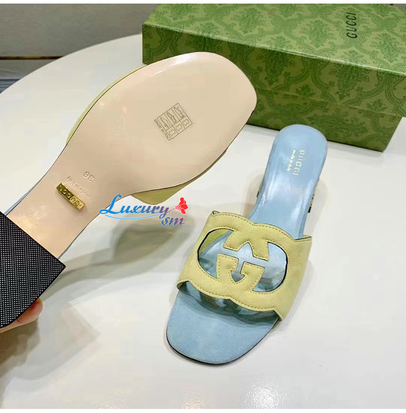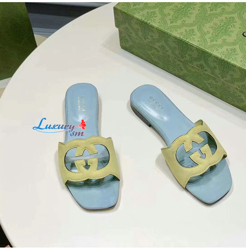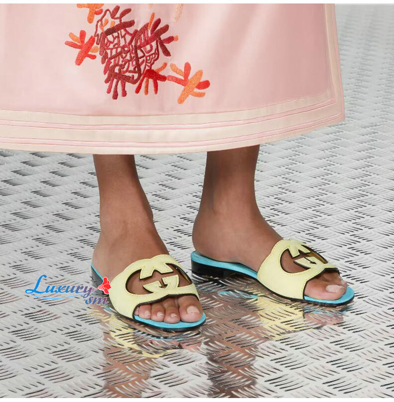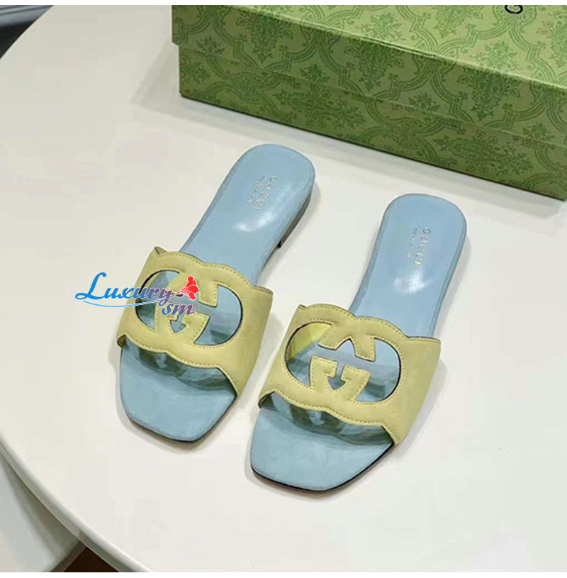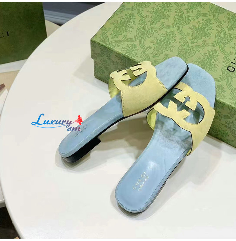 GUCCI-694451 7412 구찌 블루 인터로킹 G 컷아웃 슬라이드 샌들 여성용