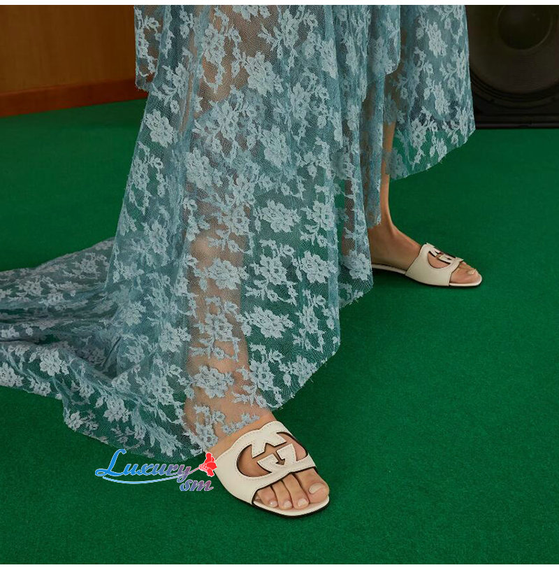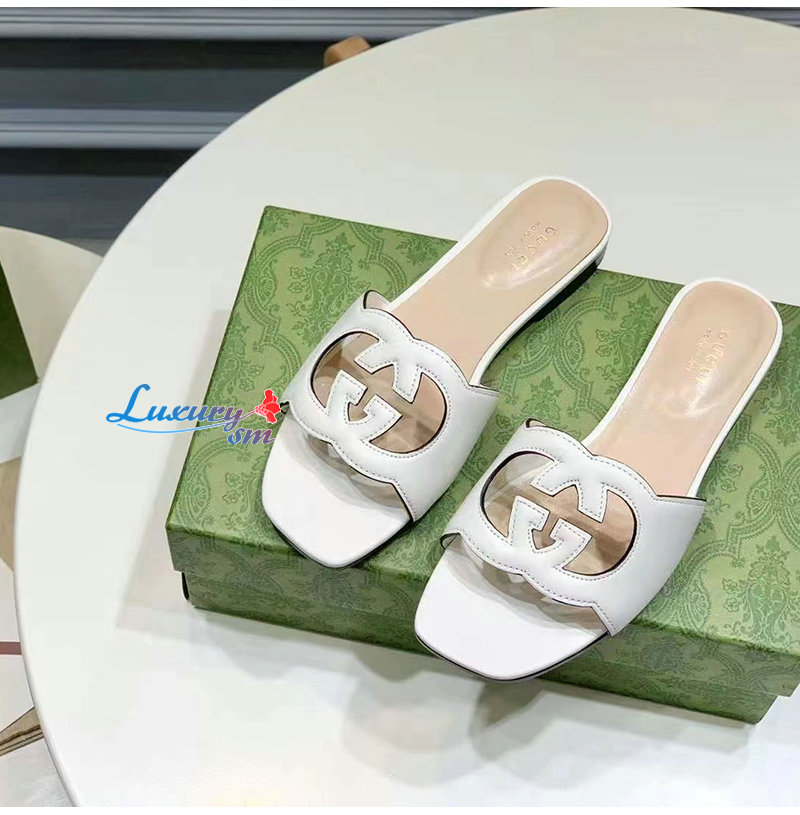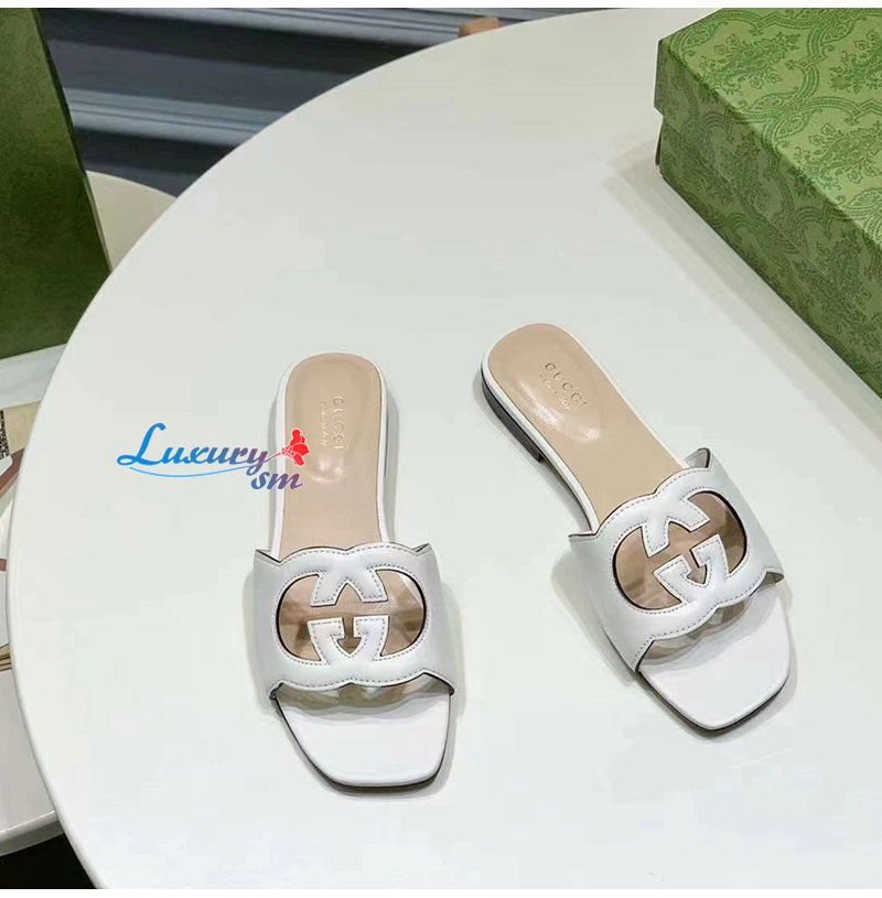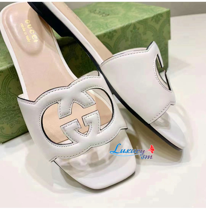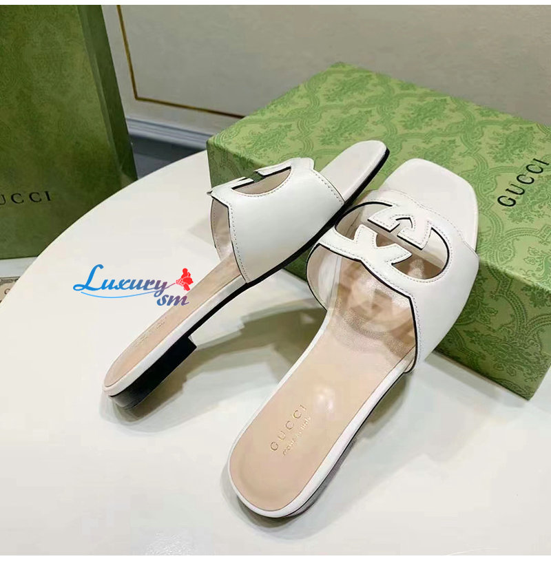 GUCCI-694451 9022 구찌 화이트 인터로킹 G 컷아웃 슬라이드 샌들 여성용