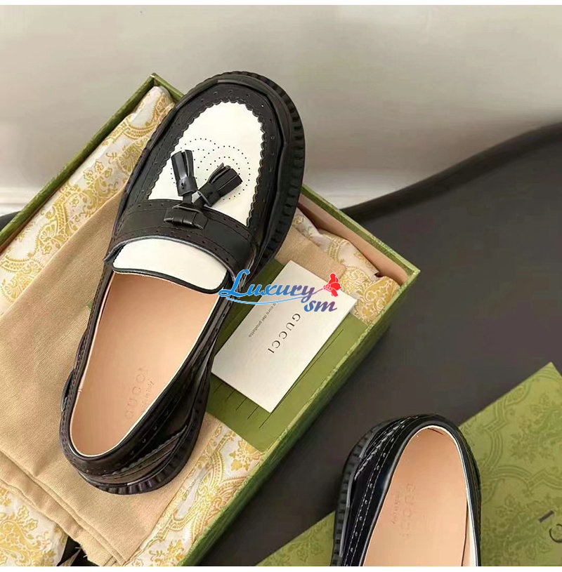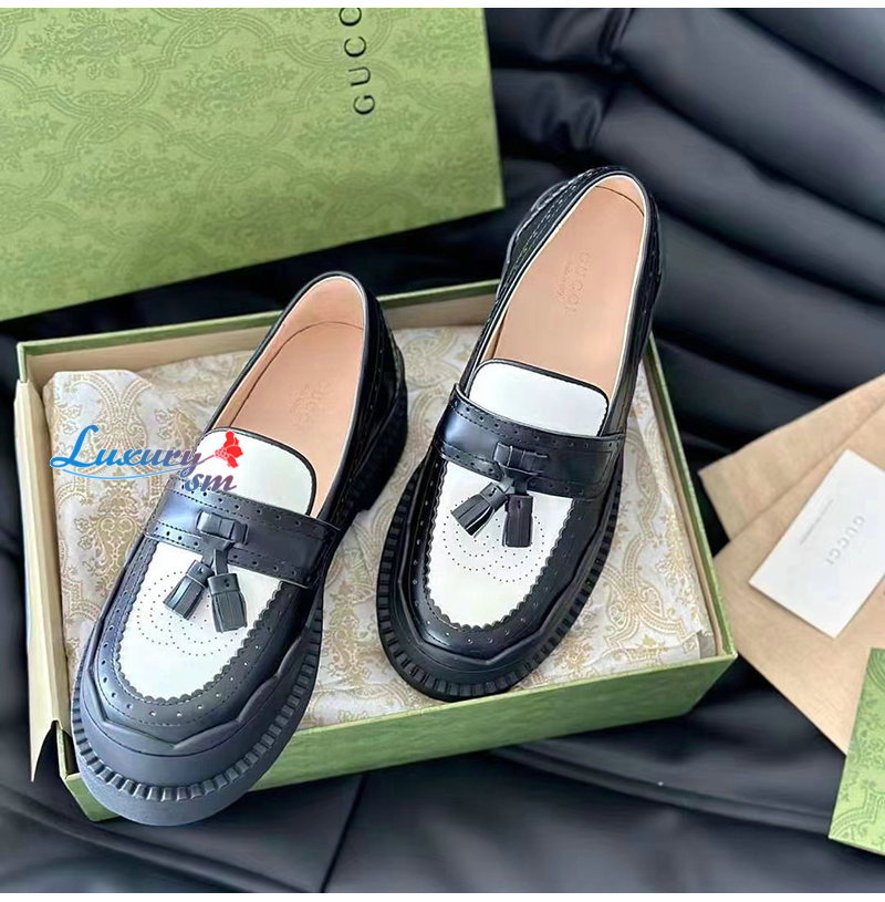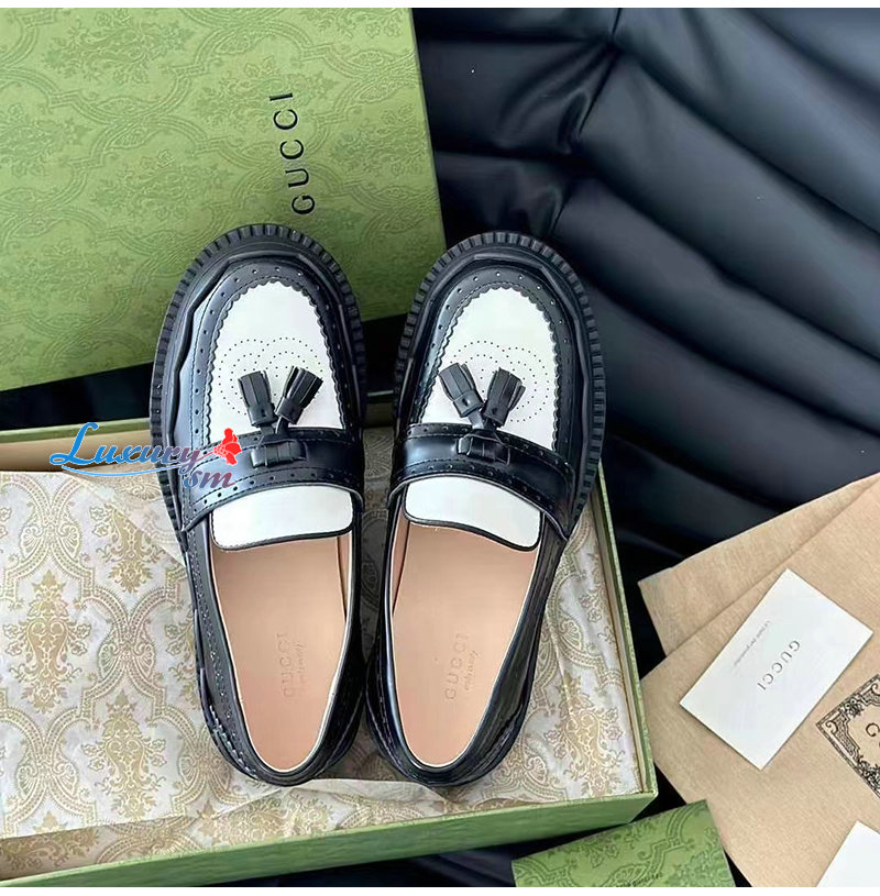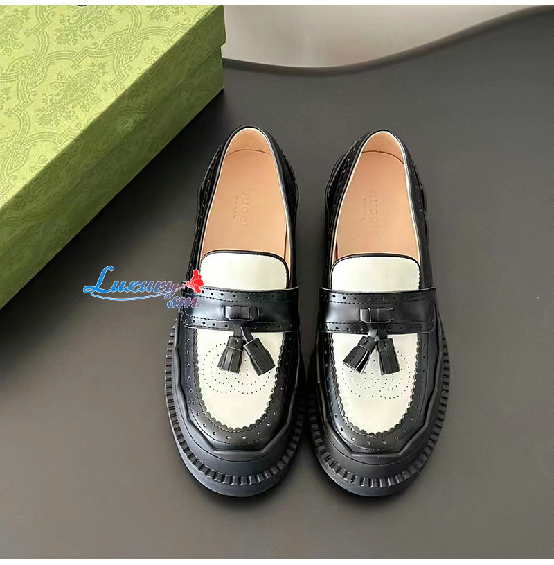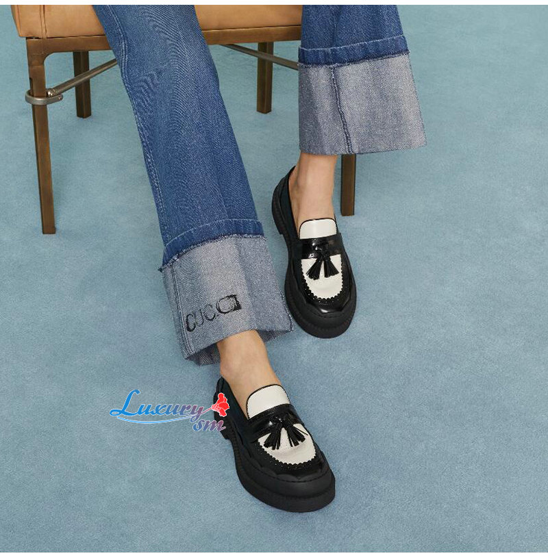 GUCCI-750438 1061 구찌 블랙/화이트 샤이니 레더 인터로킹 G 러그 로퍼 여성용