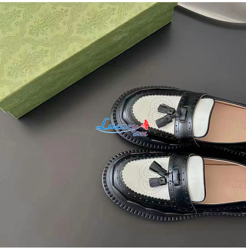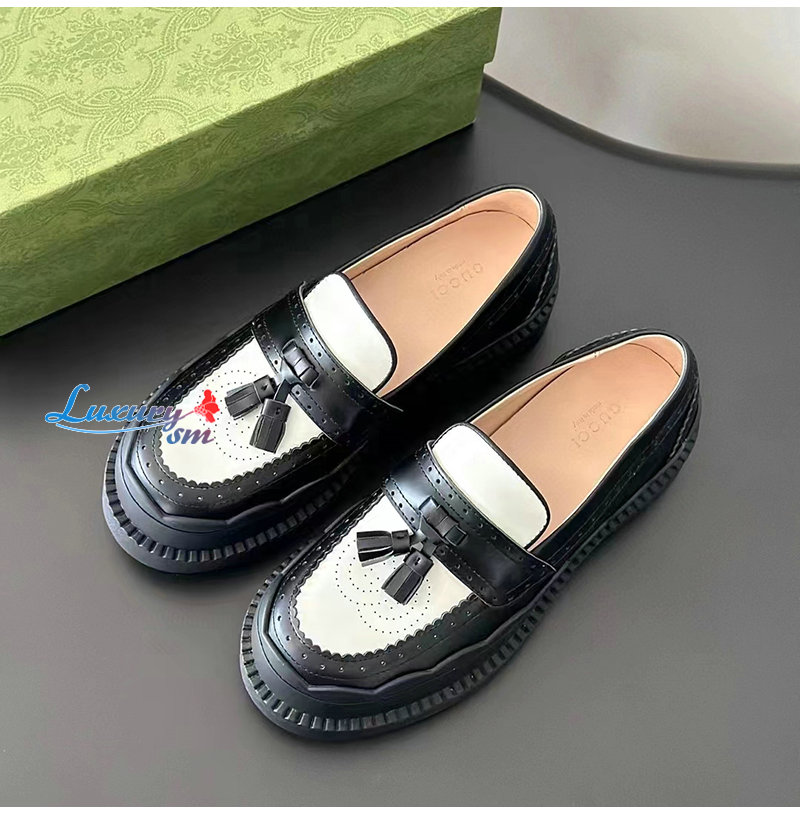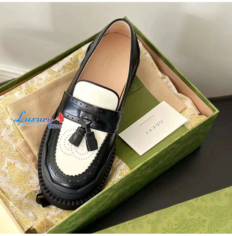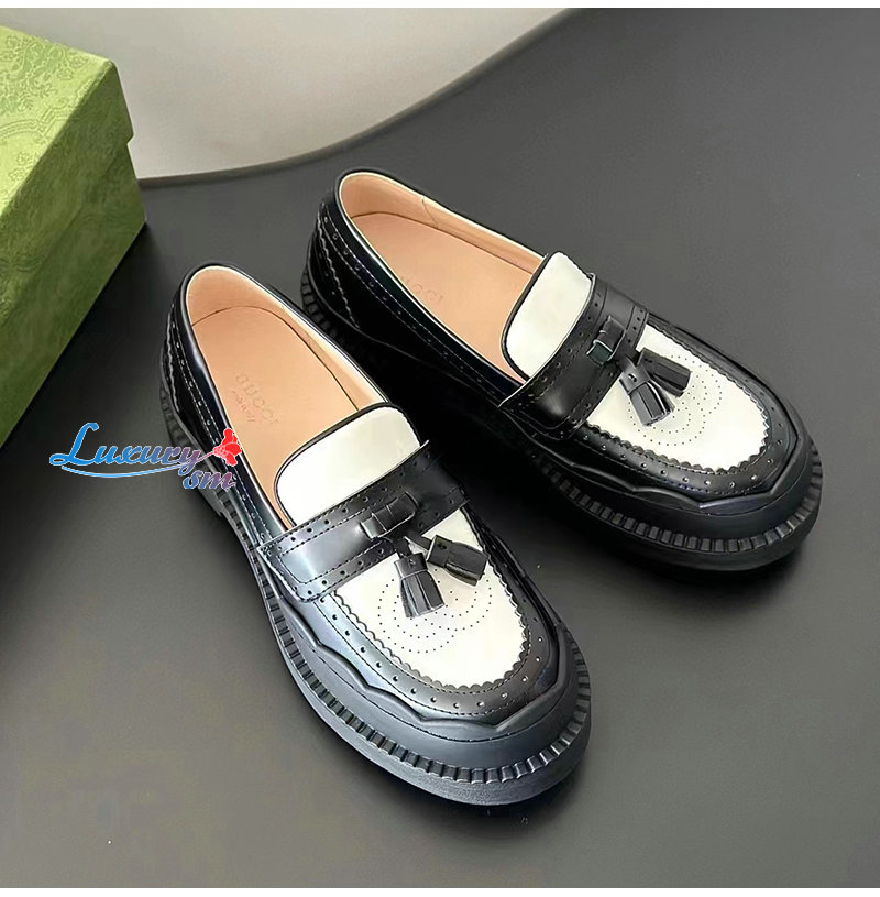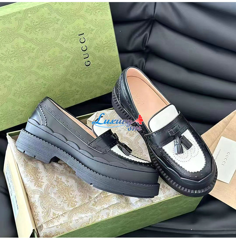 GUCCI-750438 1061 구찌 블랙/화이트 샤이니 레더 인터로킹 G 러그 로퍼 여성용