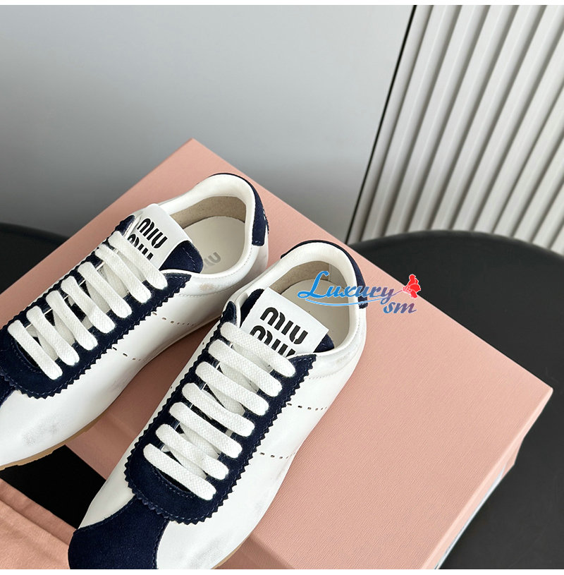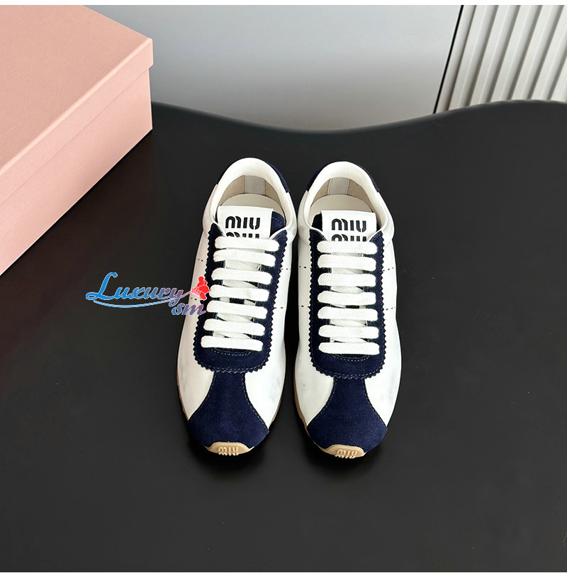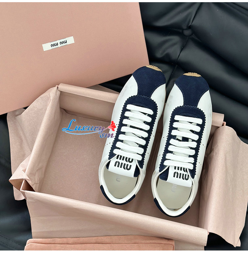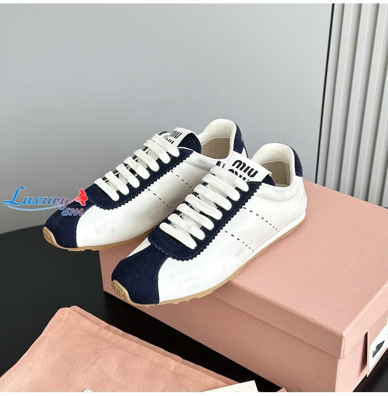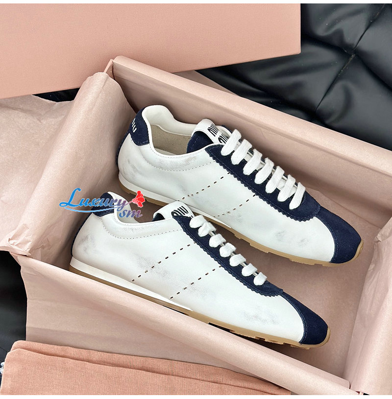 MIUMIU-5E114E 미우미우 화이트/블루 플룸 나파 가죽 스웨이드 스니커즈 여성용
