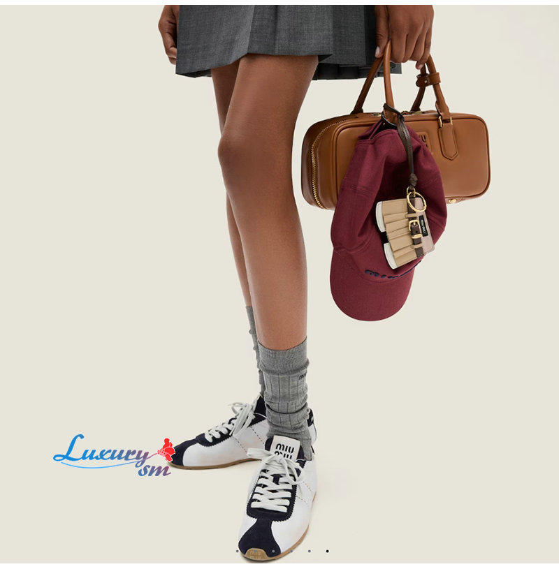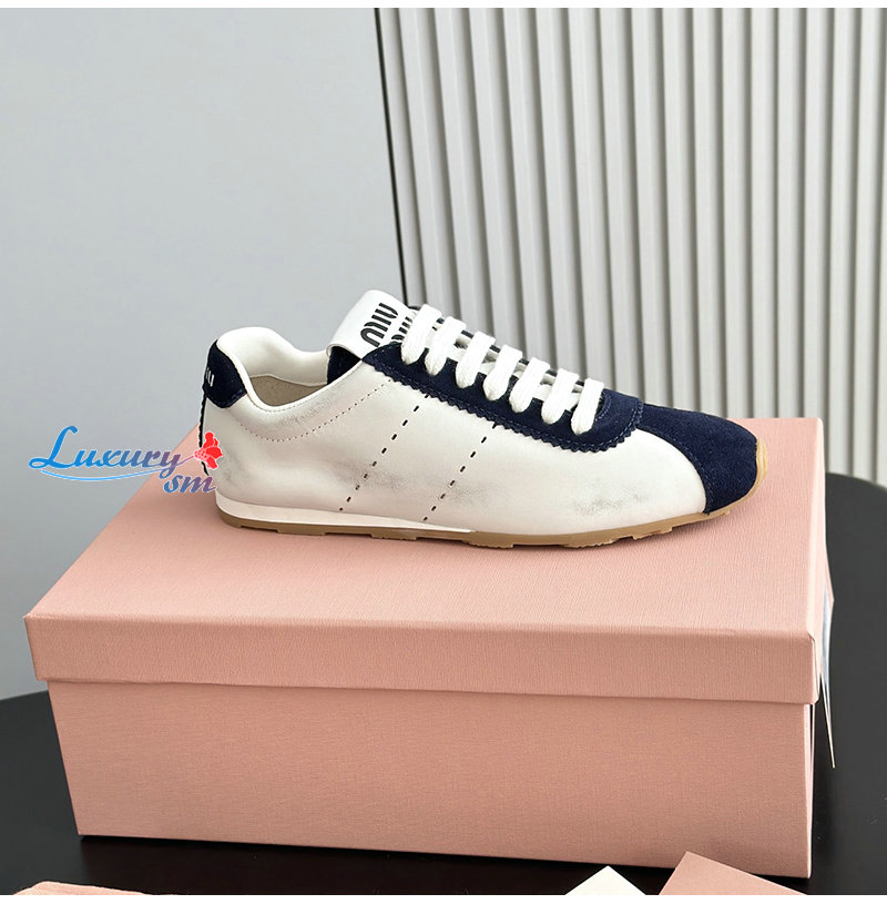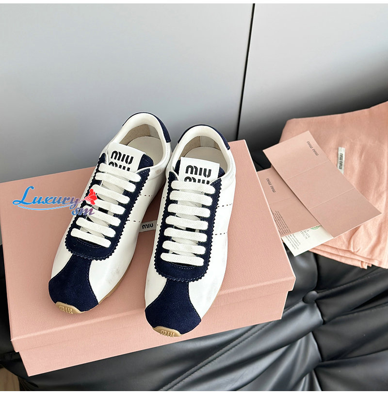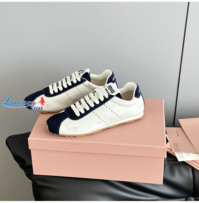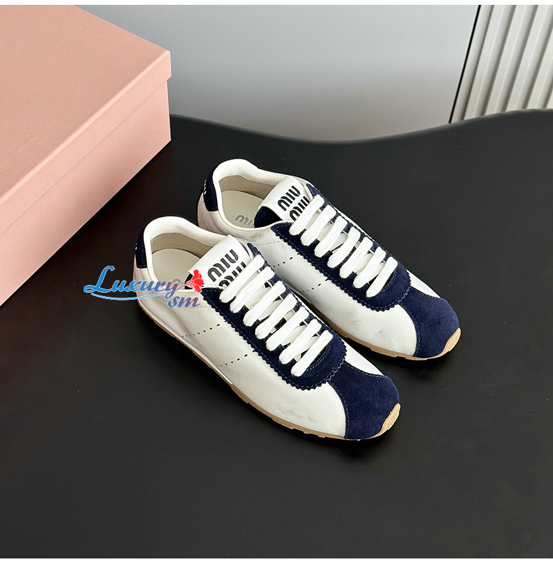 MIUMIU-5E114E 미우미우 화이트/블루 플룸 나파 가죽 스웨이드 스니커즈 여성용