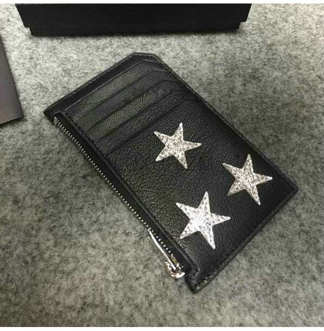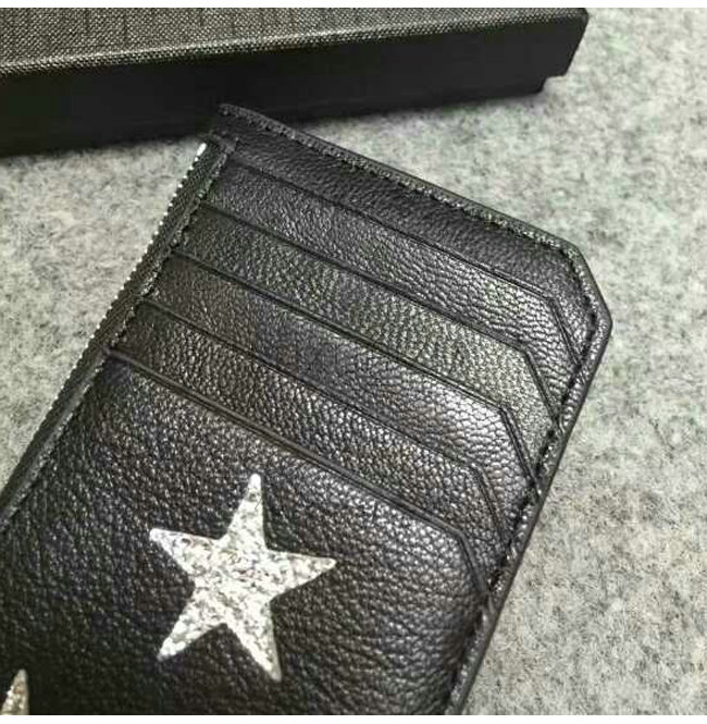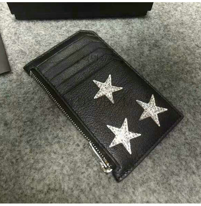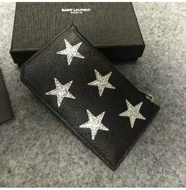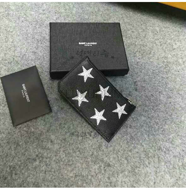 -프론트 카드 슬롯과 별 모양 아플리케 디테일의 클래식 생 로랑 지퍼 케이스.