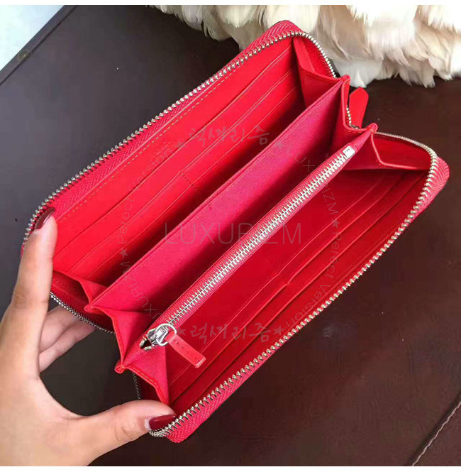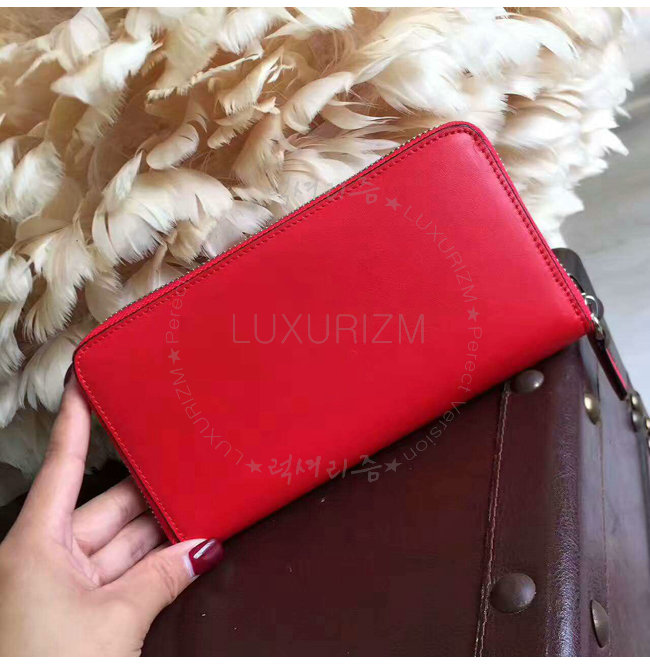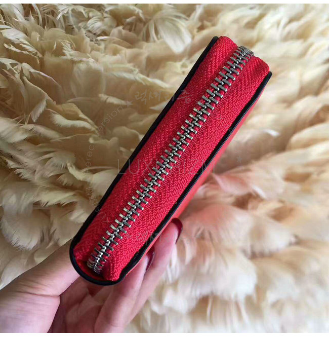 플레임 레드 컬러의 가죽 지퍼 어라운드 지갑. 아이코닉 원뿔형 메탈