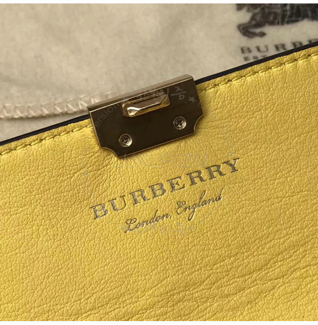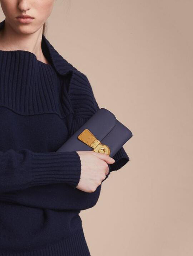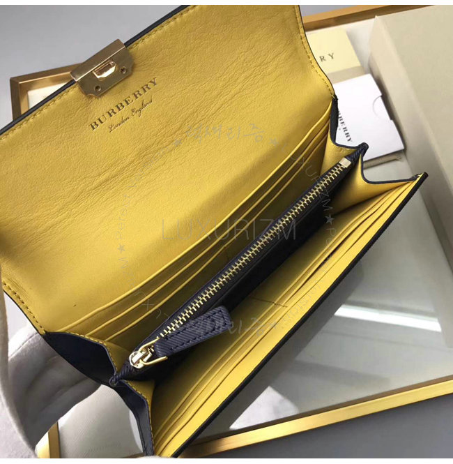 버버리만의 새로운 트렌치 가죽 소재로 제작된 장지갑. 독특한 잠금 장식이 돋보이며