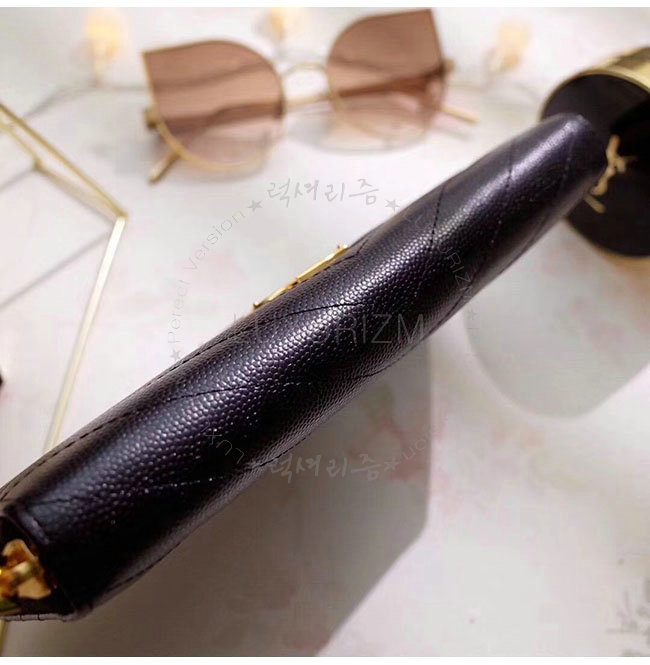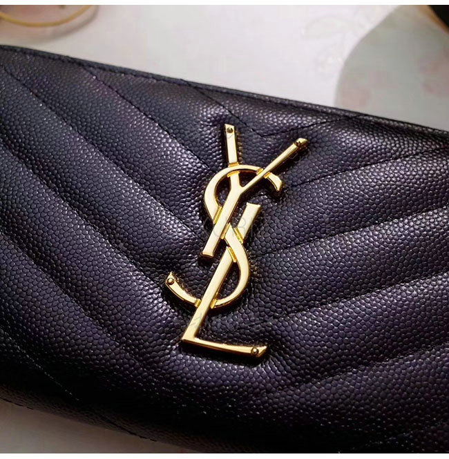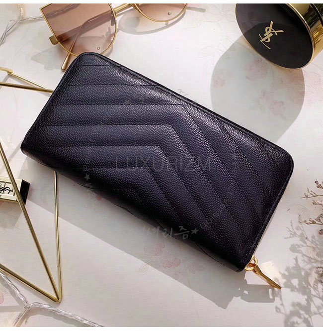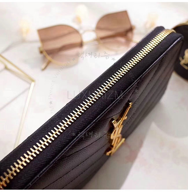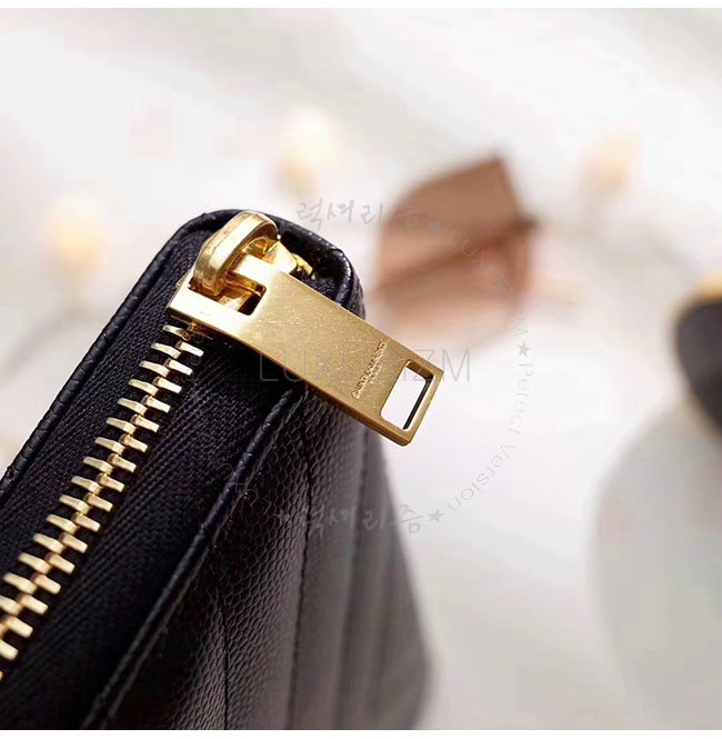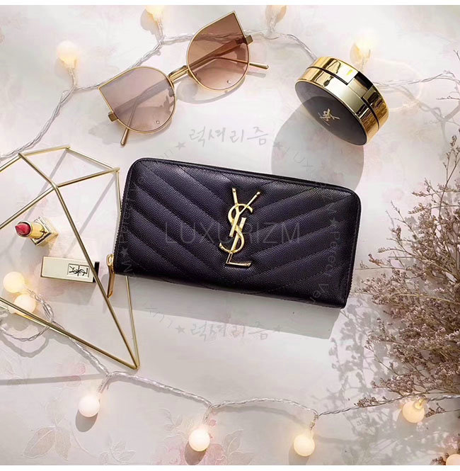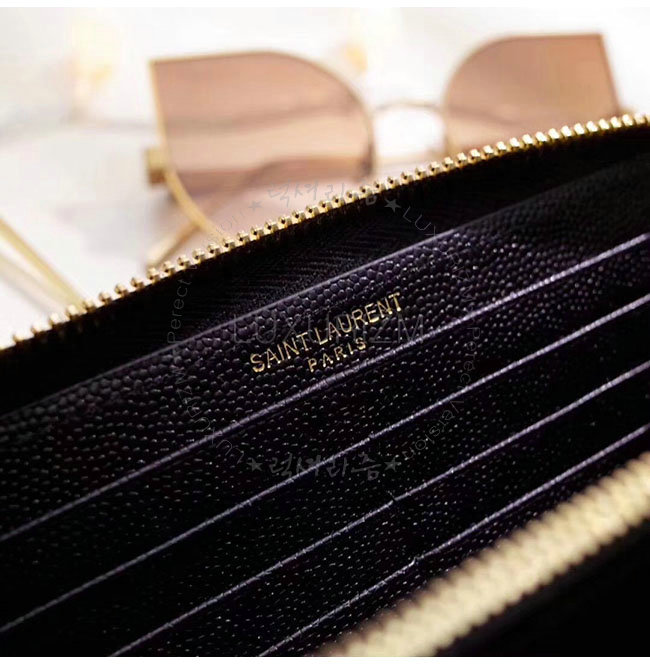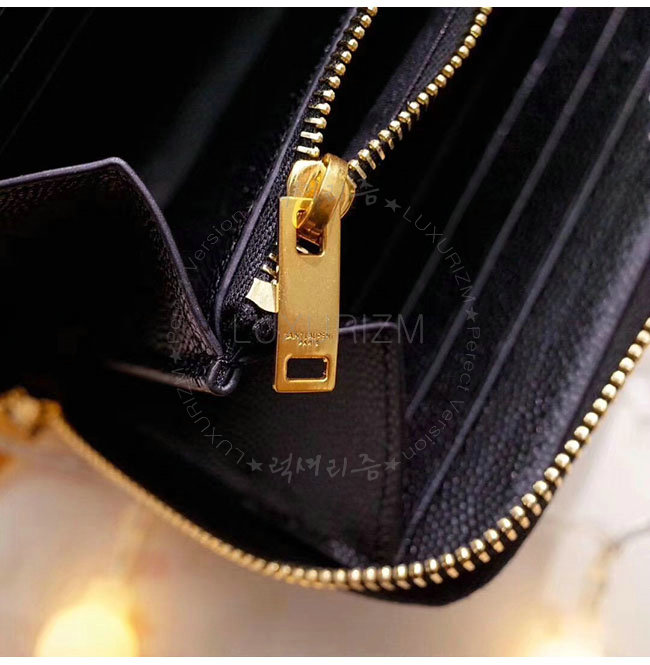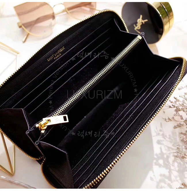 [스폐셜오더]SAINT LAURENT-358094 생로랑 블랙 그랑 드 뿌드르 텍스처드 마틀라세 가죽 소재의 금장 모노그램 생 로랑 지퍼 어라운드 지갑