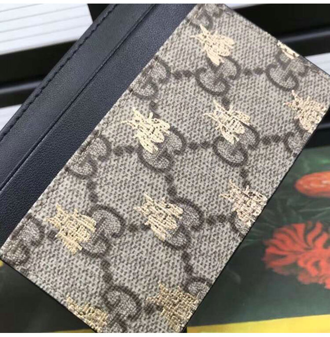 베이지/에보니 GG 슈프림 캔버스 벌 모양 프린트 친환경 소재 블랙 가죽 트리밍 5개의 카드 슬롯.